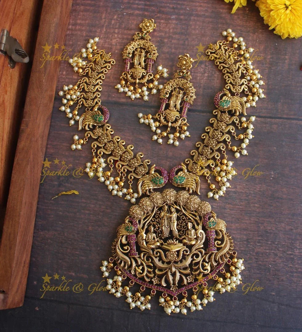 The necklace features delicate pearl beads cascading gracefully, enhancing its traditional allure. Perfect for weddings and grand celebrations, this necklace captures the essence of Indian heritage.