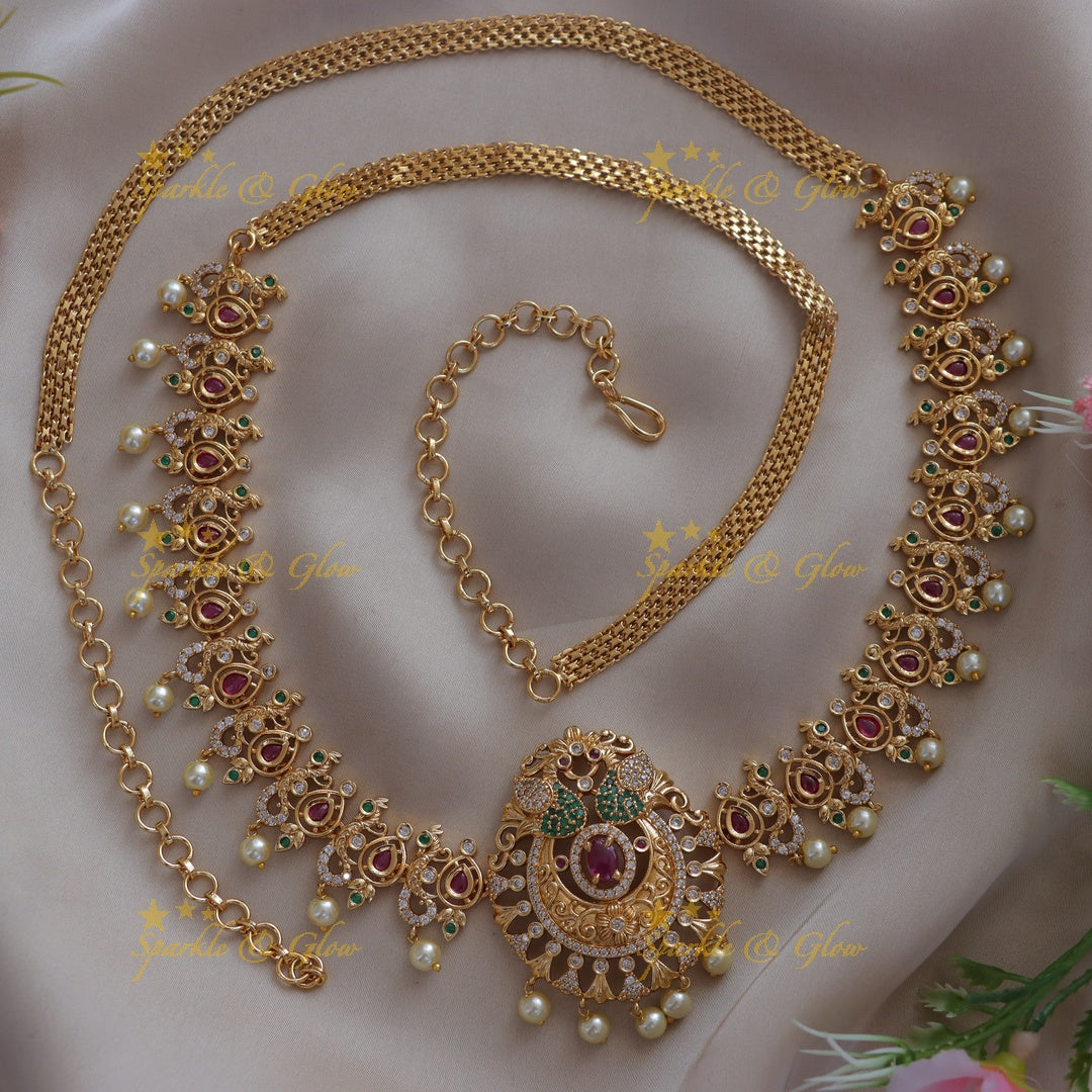 Our hipchain showcases a stunning array of intricately designed peacock motifs studded with sparkling stones, surrounded by lustrous pearls that enhance its appeal. The gold finish adds opulence, ensuring you stand out during your special events.