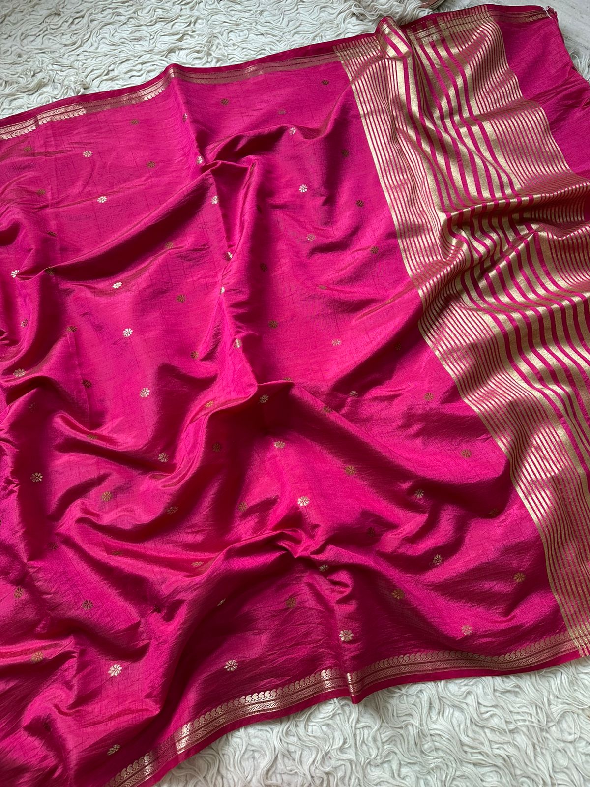 Introducing our classic Banarasi Munga Silk Saree with an exquisite blouse set, an epitome of elegance and traditional craftsmanship. Perfect for weddings, festive occasions, and special gatherings, this saree captures the essence of Indian heritage with a contemporary touch. The rich pink hue with intricate golden motifs blends tradition and fashion seamlessly. Experience the grace and charm of Banarasi silk wrapped in one beautifully crafted ensemble.