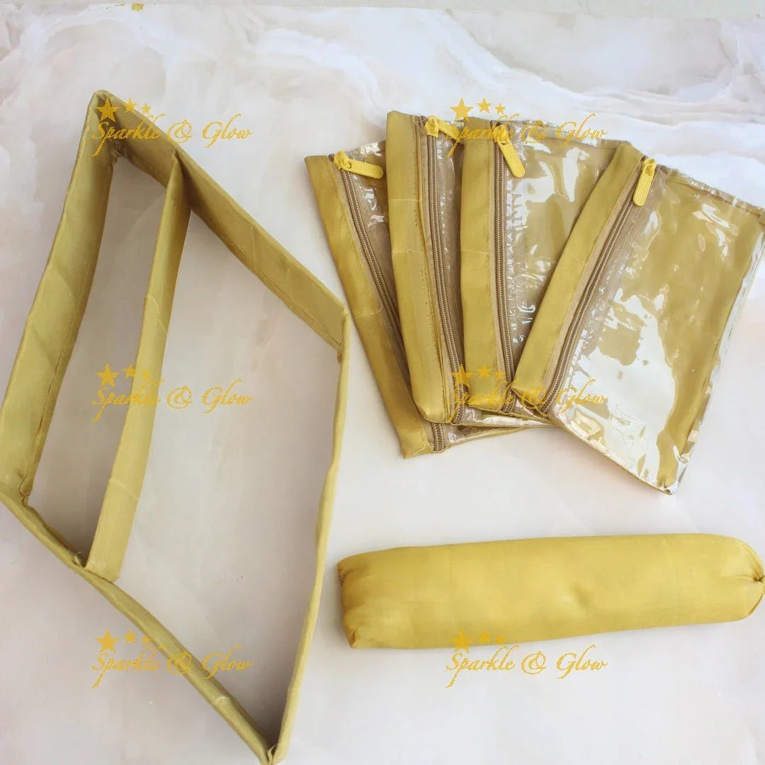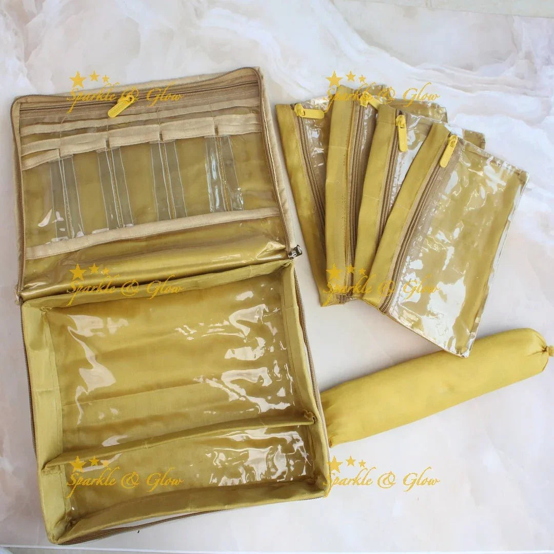 Discover elegance with our Embroidered Jewelry Organizer – a perfect blend of style and functionality. This exquisite piece features intricate golden embroidery on a soft cream fabric, adorned with delicate floral motifs and shimmering beads. The organizer's rich finish enhances its luxurious appeal, making it an ideal accessory for festive occasions and weddings.