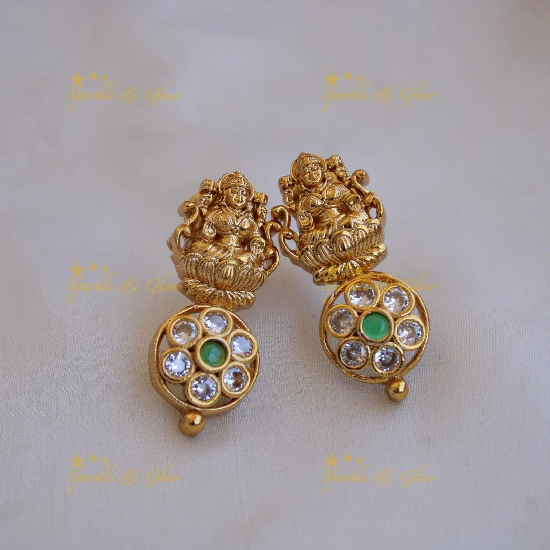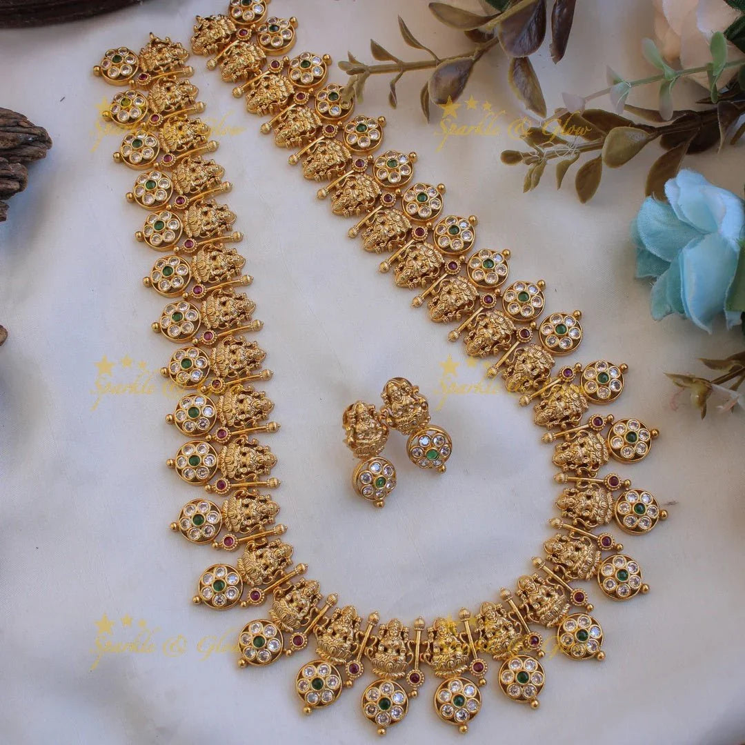 Embrace the divine elegance of our Emerald Lakshmi Bottu Long Necklace for Women, a masterpiece that embodies grace and tradition. This exquisite piece features intricate motifs of Goddess Lakshmi, symbolizing wealth and prosperity, adorned with lush emerald and pristine white stones. The rich golden finish adds a regal touch, making it perfect for festive occasions and celebrations.