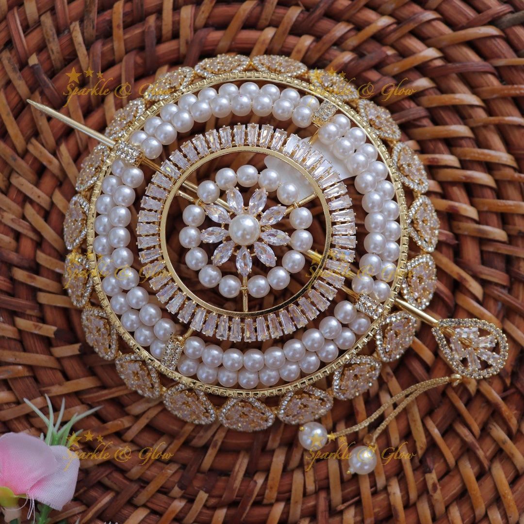 The hair bun features an intricate floral design adorned with lustrous pearls, meticulously set on a gold-toned base. Each element of this accessory has been crafted with perfection, reflecting the richness and diversity of Indian culture. Its elegant appearance makes it ideal for weddings, festive occasions, or any special event.