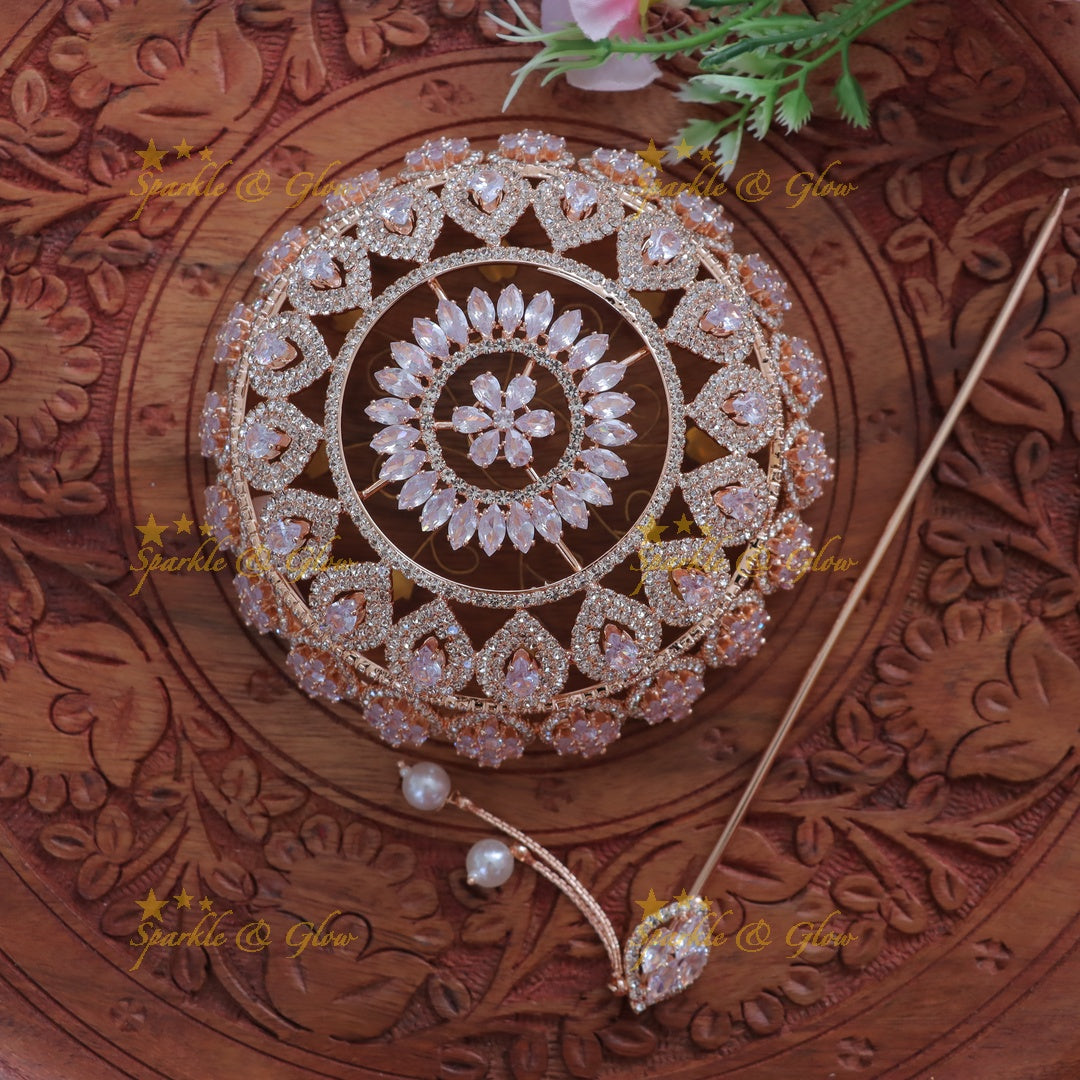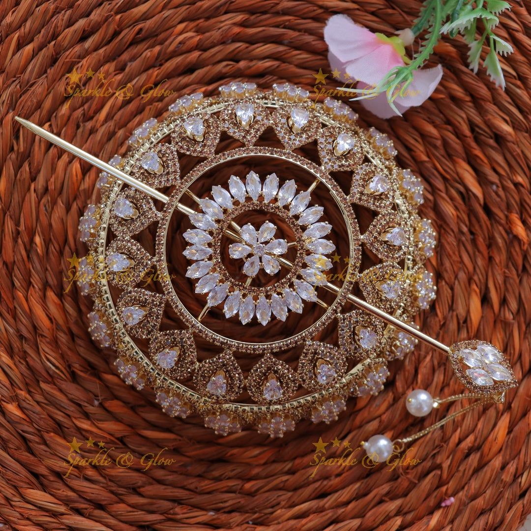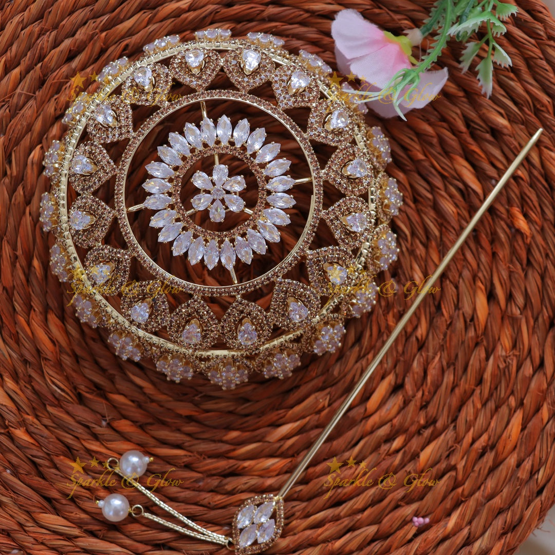 This Gold Bridal Hair Bun is not only an accessory but a statement piece that will make you stand out on your special day. Its design is inspired by traditional Indian craftsmanship but tailored for today’s fashion-forward brides. Whether you're adorning a bridal set or pairing it with a hair accessory, this piece is versatile enough to complement various types of wedding outfits.