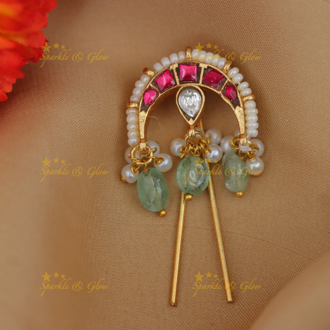 Unveiling the stunning Exquisite Jadau Gold Hair Pin, an epitome of traditional artistry blended with contemporary elegance. This meticulously crafted hair accessory is every bride's dream, designed to add a touch of regal beauty to your hairdo. Whether you're attending a wedding, festival, or any grand celebration, this hair pin is your ideal companion.