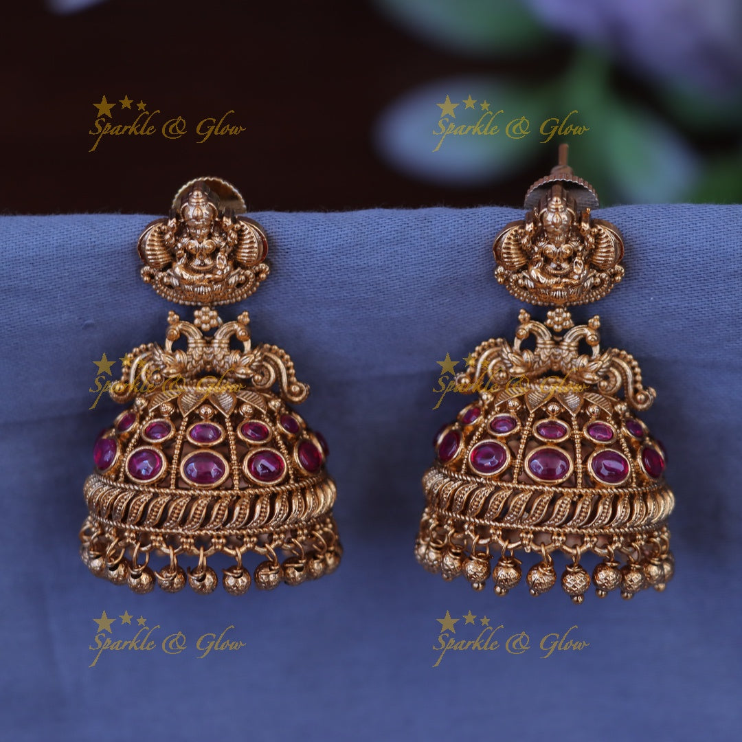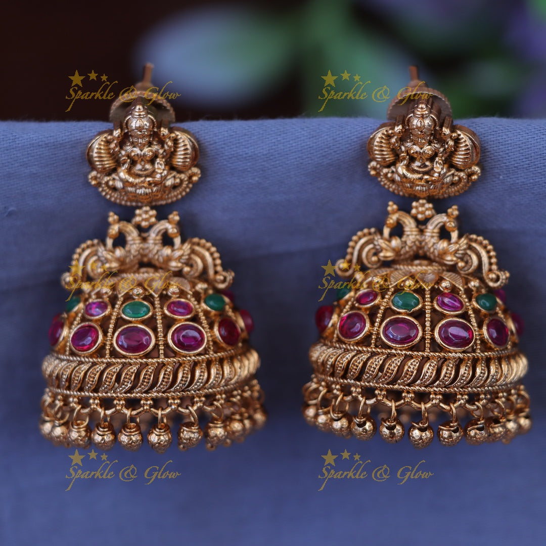 - Design: Inspired by the temple jewellery tradition, these jhumkas showcase detailed depictions of Goddess Lakshmi, enhancing their divine appeal.
