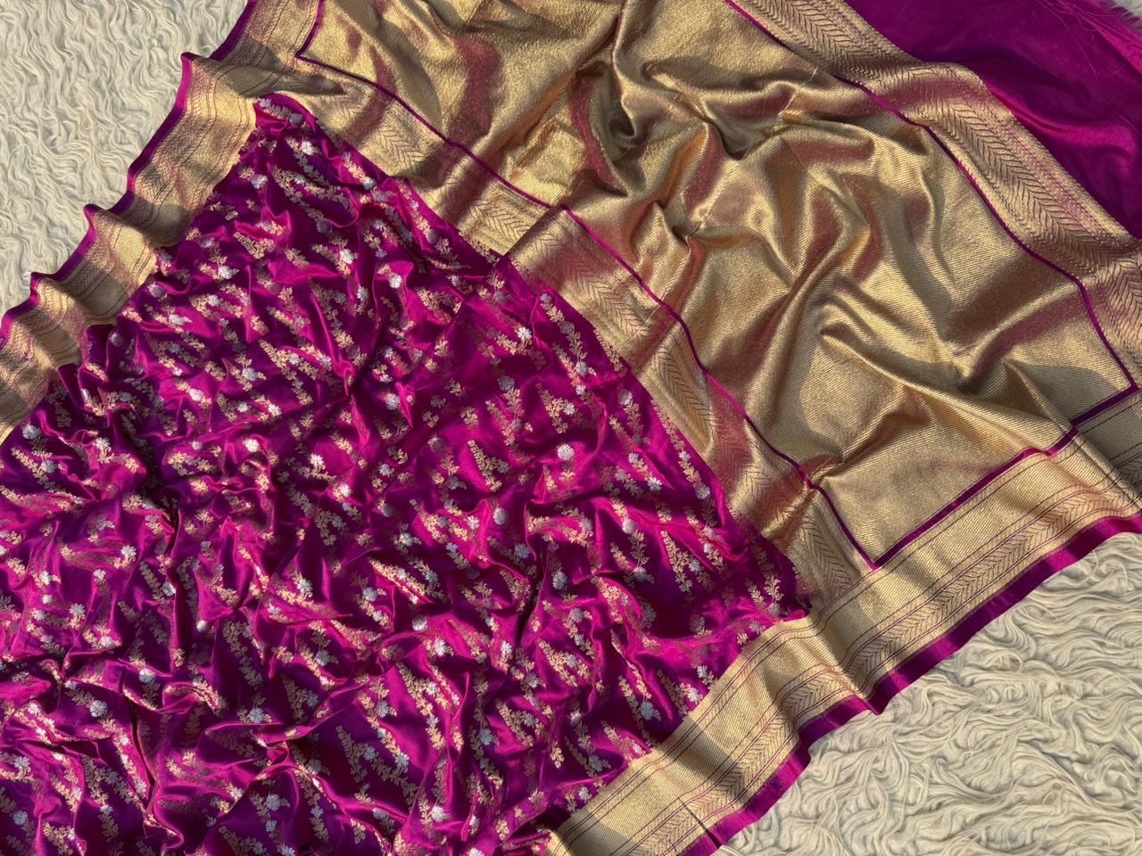 The rich texture and design draw inspiration from the heart of Banaras, infusing each thread with cultural heritage and artisanal expertise. The opulent golden zari work elegantly complements the deep magenta hue, making it a standout piece in your wardrobe.