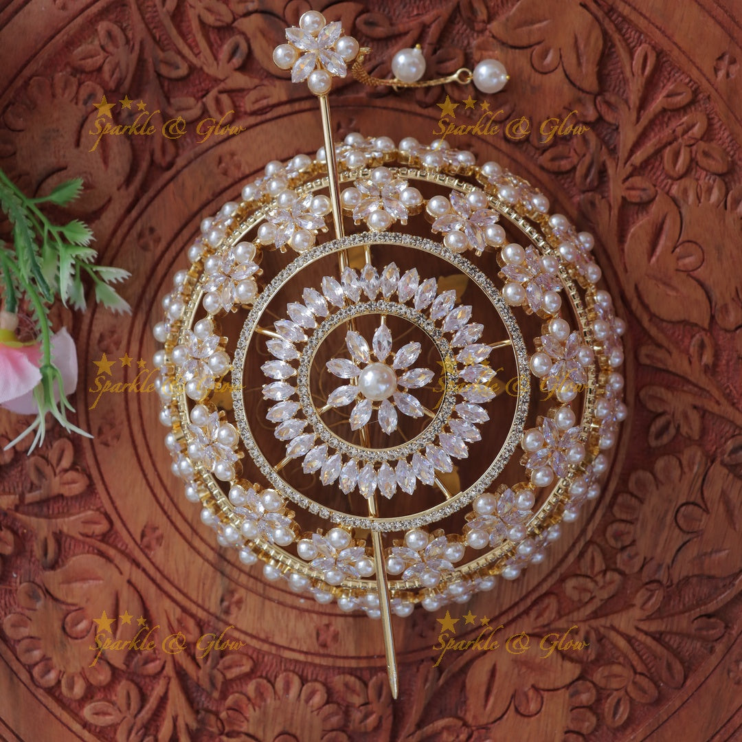 Immerse yourself in the elegance of our Exquisite Floral Bun Pin, a stunning piece crafted to enhance the beauty of any hairstyle. This premium Indian imitation jewellery item is designed with intricate floral motifs and adorned with shimmering faux pearls and stones, mimicking the opulence of nature’s finest blooms. Ideal for weddings, festive occasions, or any celebration that demands a touch of luxury.