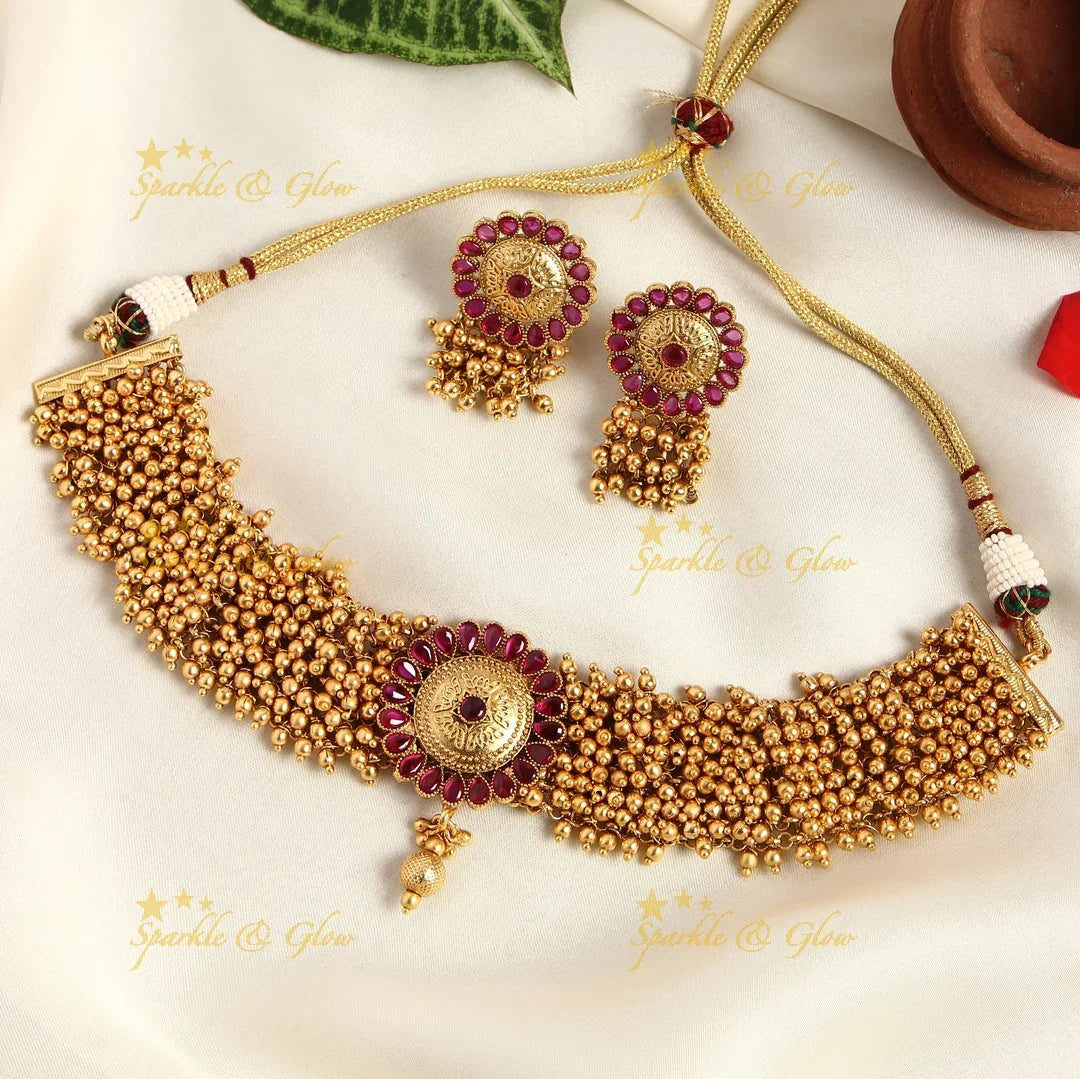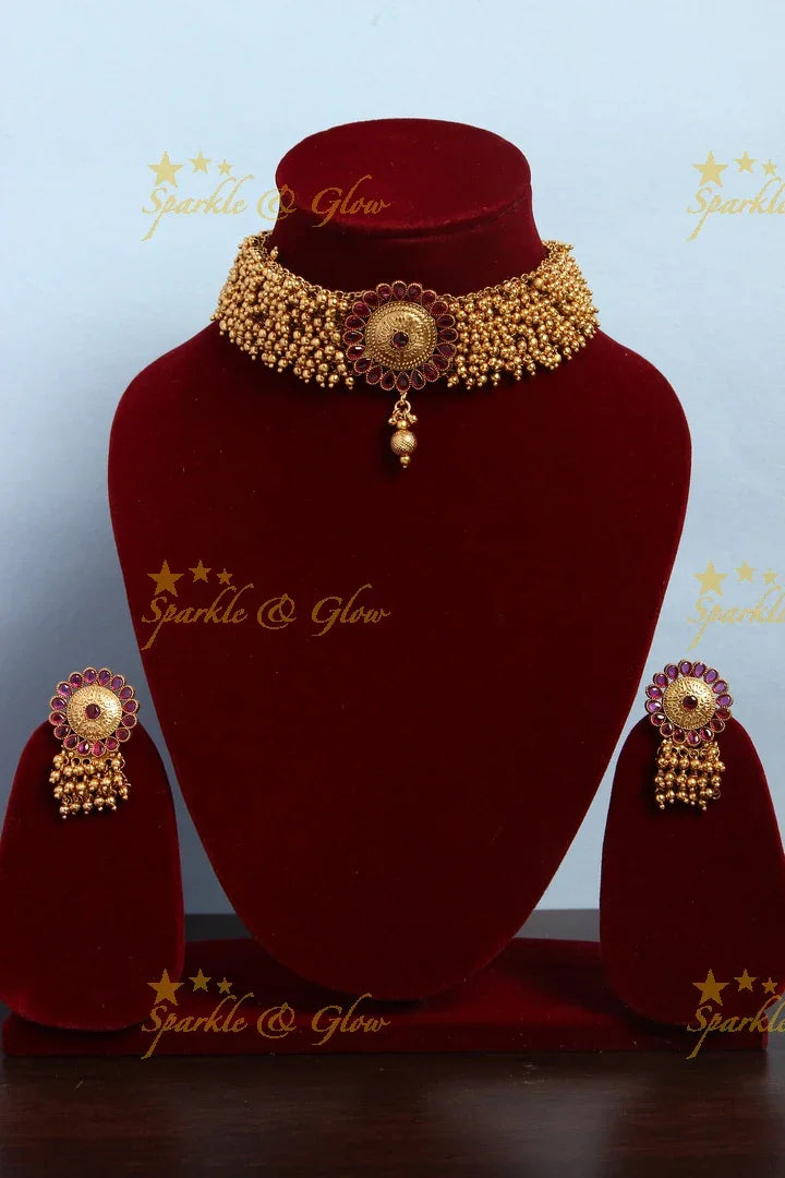 Embrace elegance with our Floral Cluster Bead Gold-Tone Choker, a masterpiece that embodies the spirit of festivity. This exquisite choker features a harmonious blend of intricate floral motifs and shimmering gold-tone beads, creating a radiant metallic finish. The vibrant clusters of beads are artfully arranged to form a high-neck design, adding a touch of regal splendor to your ensemble.