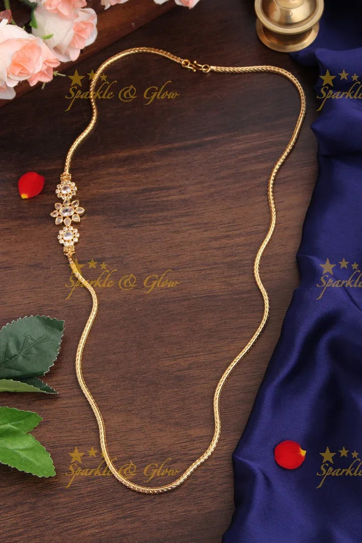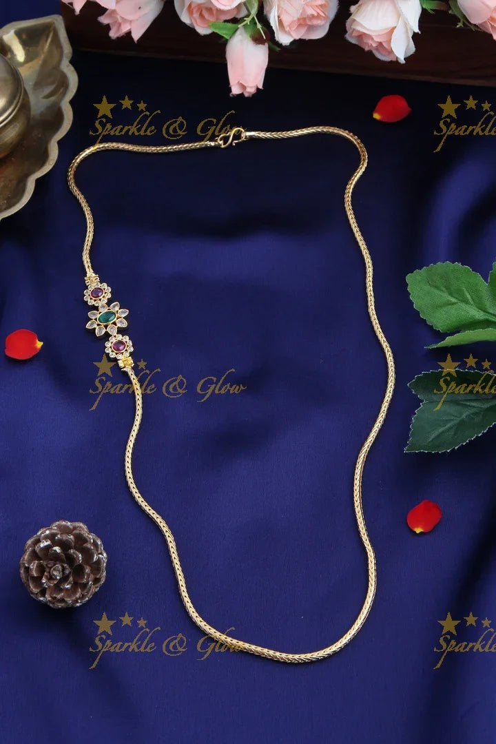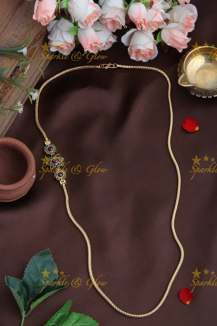Embrace elegance with our Floral Kemp Stone Gold-Plated Mop Chain, a stunning piece that seamlessly blends traditional artistry with modern style. Featuring intricate floral motifs adorned with vibrant kemp stones, this necklace exudes a festive allure perfect for any celebration. The gold-plated finish adds an opulent touch, ensuring you sparkle with grace at every occasion.