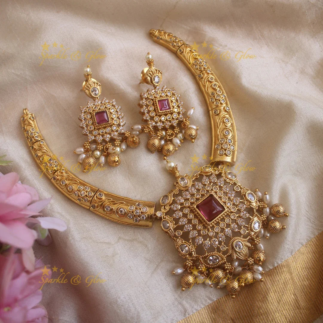 The intricate motifs and lustrous finish make this necklace a must-have accessory for any special occasion. The Halsi necklace is adorned with delicate pearl-like beads, adding a touch of grace to its luxurious appeal. The rich gold color is reminiscent of timeless elegance, making it an ideal choice for those who appreciate classic beauty.