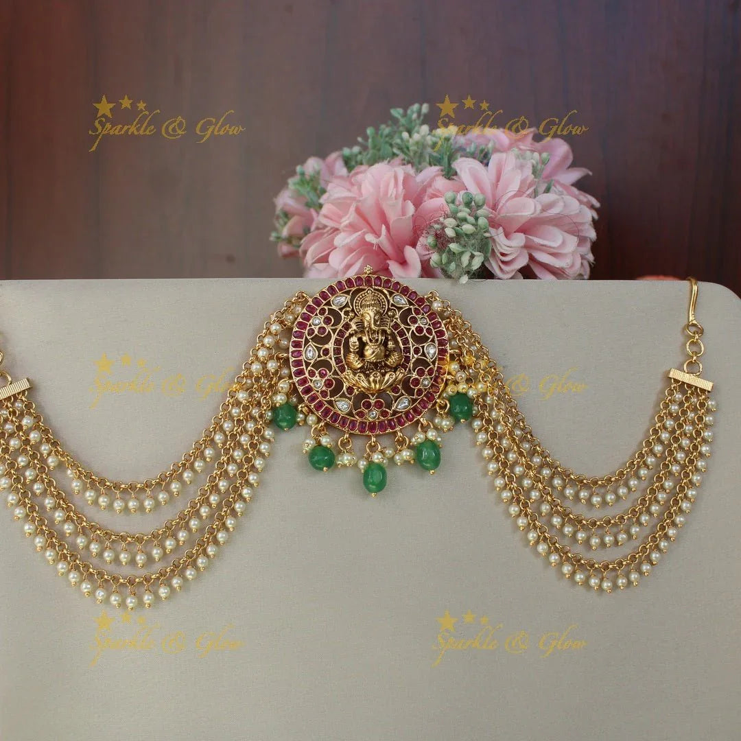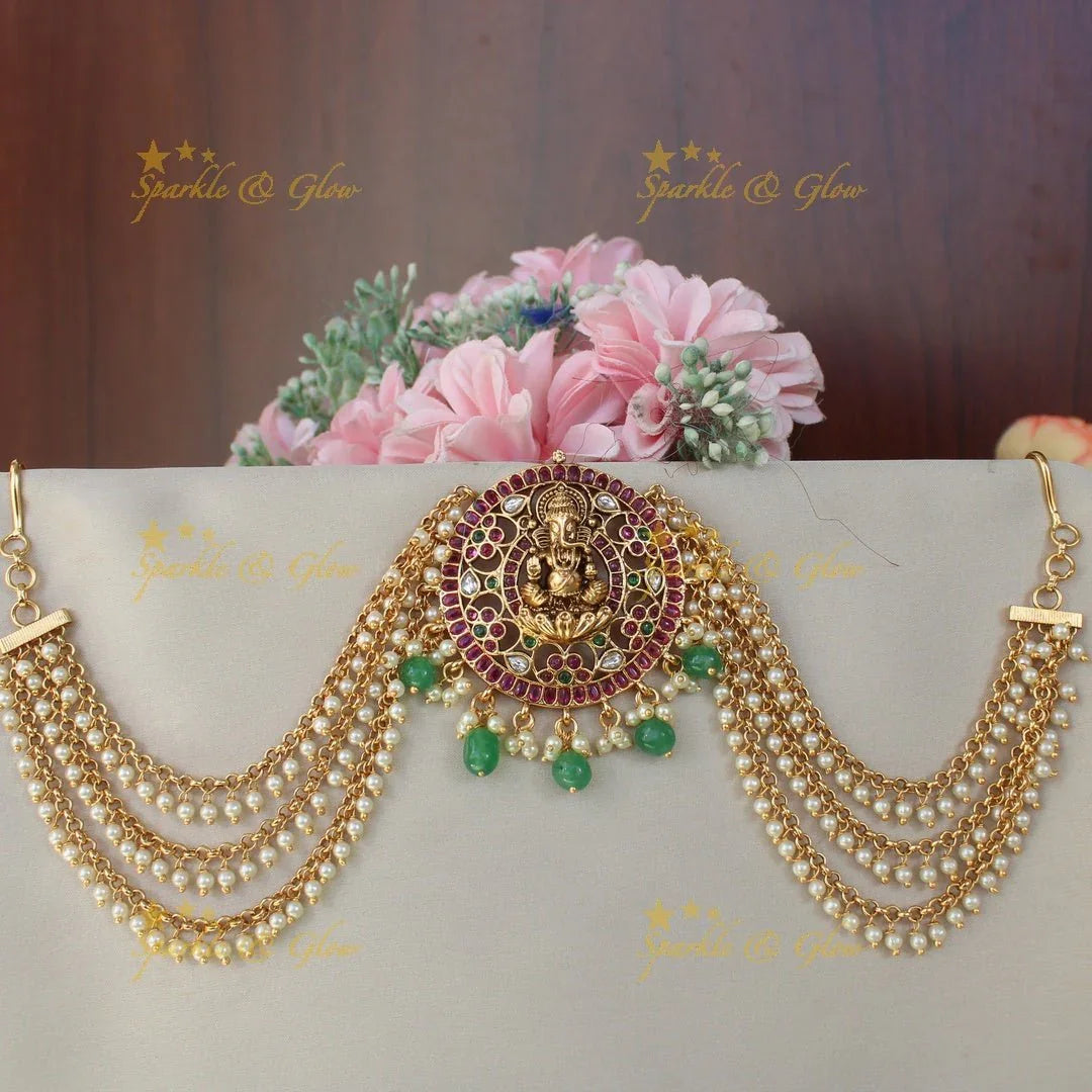 Embrace the divine elegance with our Ganesha Floral Jada Billa with Pearl Maatil - Multicolor. This exquisite piece combines traditional motifs with modern flair, perfect for festive occasions and weddings. The centerpiece features a beautifully crafted Ganesha, surrounded by intricate floral designs, symbolizing prosperity and beauty.