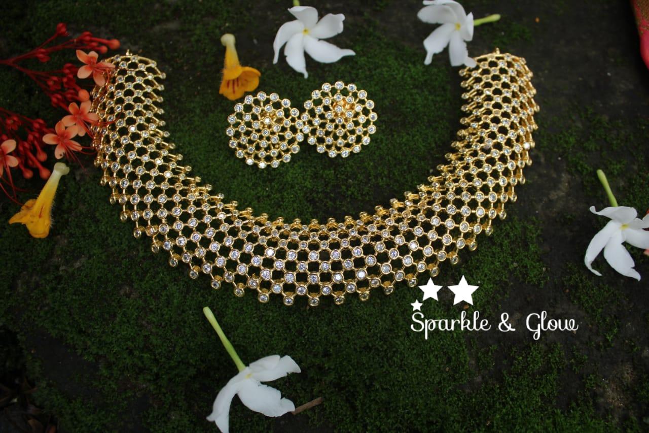 Elevate your festive ensemble with our Gold AD Stones Elegant Necklace. This exquisite piece features a stunning array of shimmering AD stones set against a radiant gold finish, creating a harmonious blend of traditional charm and modern elegance. The intricate motifs, adorned with delicate beads, exude a sense of opulence and grace, making it an ideal choice for weddings and special occasions.