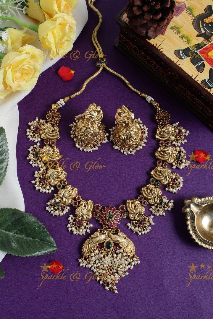 Elevate your festive ensemble with our exquisite Gold Peacock Floral Pearl Bead Necklace. This masterpiece showcases intricate peacock motifs that exude elegance and grace. The necklace is adorned with delicate floral carvings and lustrous pearl beads, all set in a rich gold finish that captures the essence of traditional Indian artistry. The vibrant hues of emerald green and ruby red accentuate the luxurious appeal, making it a perfect accessory for any celebratory occasion.