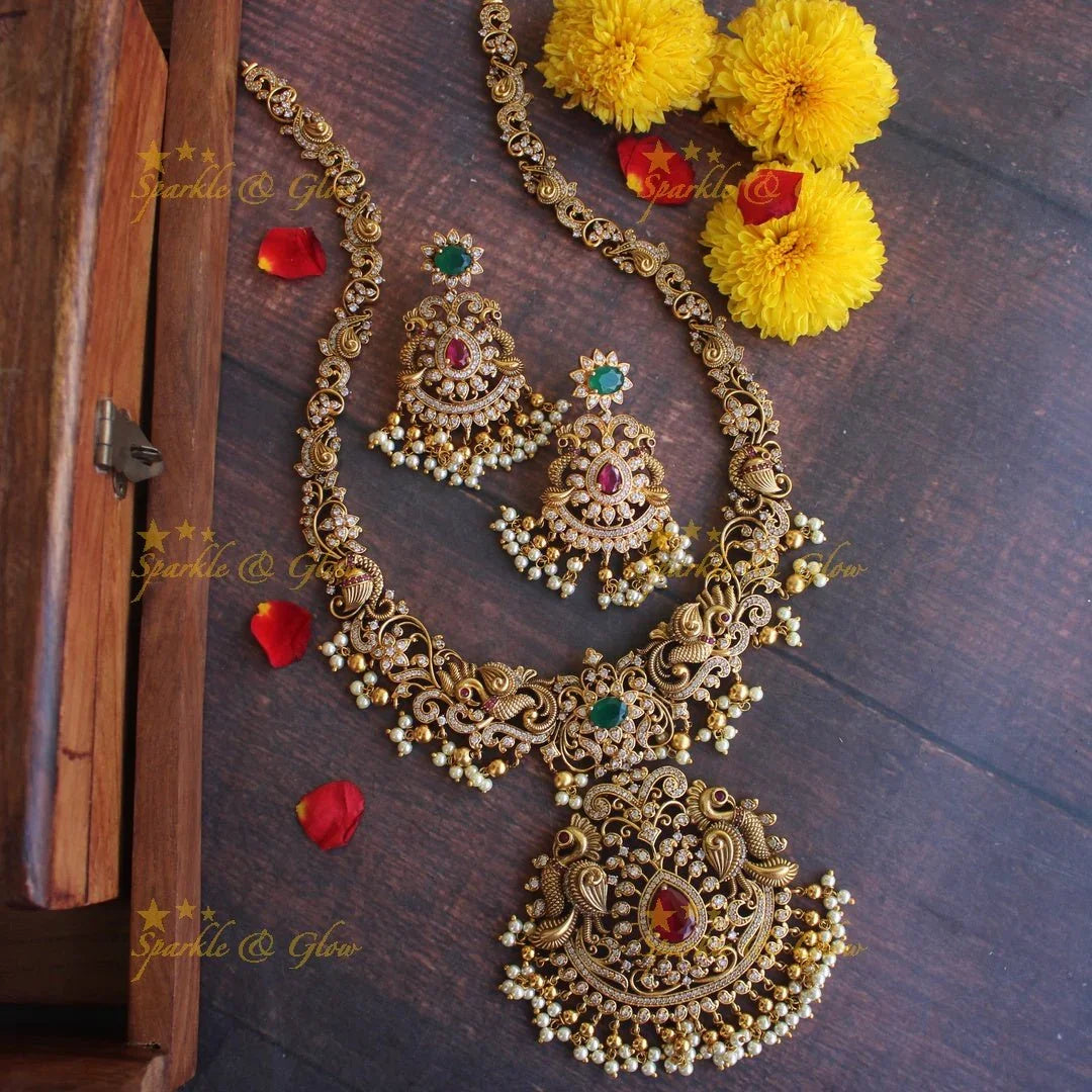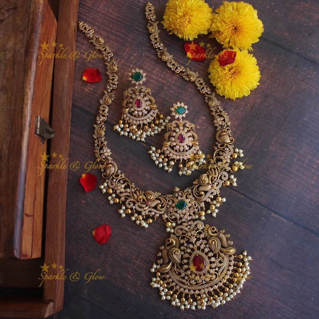 Discover the exquisite elegance of the Gold Polish CZ Peacock Haram—a masterpiece of antique charm and modern sophistication. This haram radiates opulence with intricate peacock motifs, reminiscent of royal Indian tradition. Its lustrous gold finish is adorned with dazzling cubic zirconia stones, capturing light with every movement. The deep reds and greens of the stones add a festive vibrancy, perfect for any celebration. Delicate pearl beads cascade gently, enhancing the haram's majestic allure.