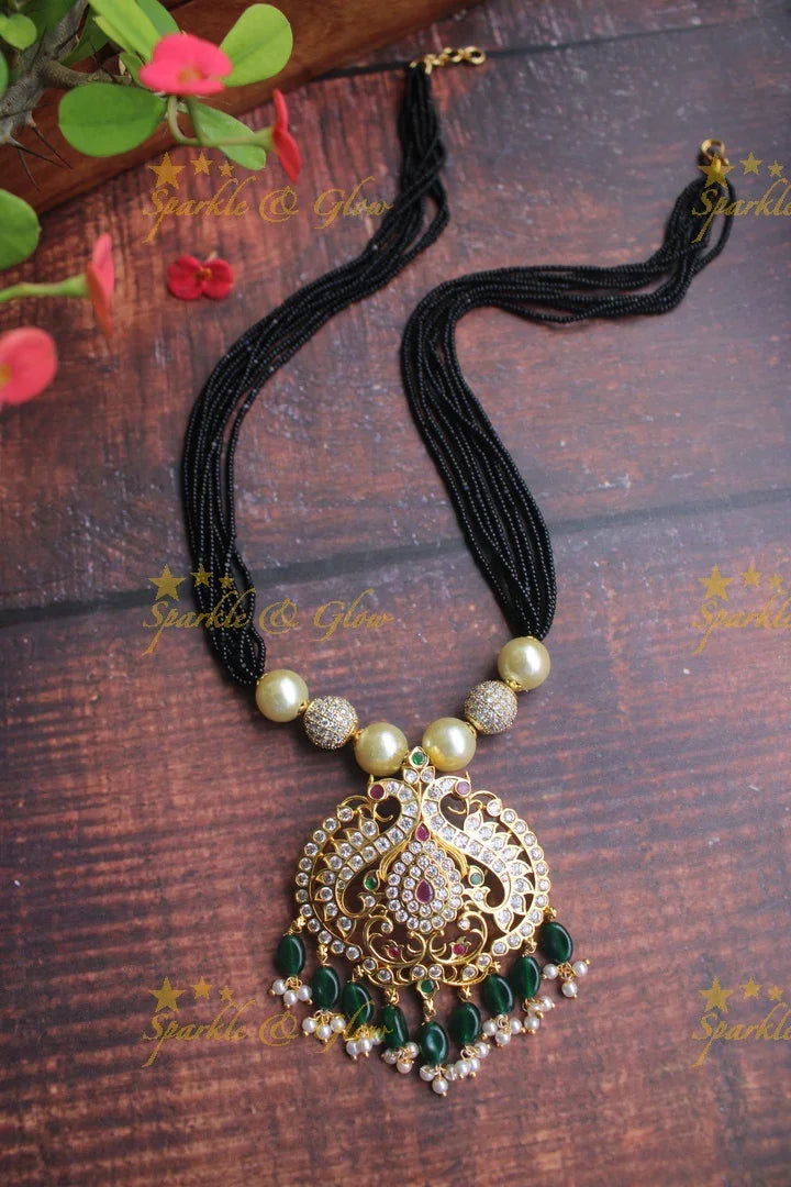 Gold Polish Peacock Pendant & Black Beads Haram