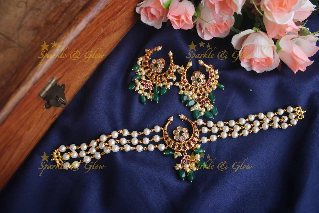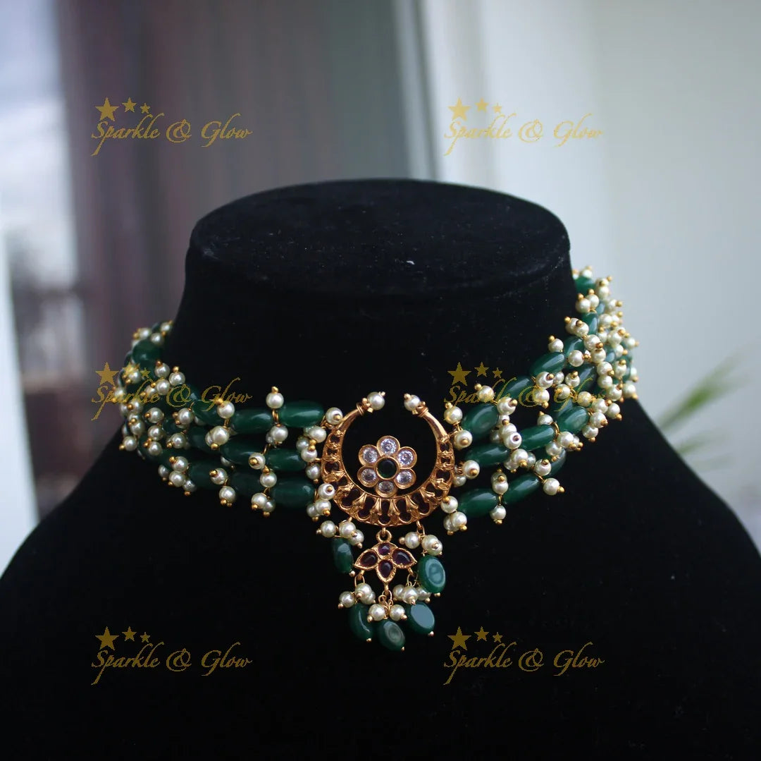 Embrace elegance with our Green Bead & Kemp Stones Moon Choker Necklace, a perfect blend of tradition and style. This exquisite piece features lustrous green beads intertwined with vibrant kemp stones, crafted in a stunning moon motif. The intricate gold finish adds a touch of regal charm, making it an ideal choice for festive occasions and weddings. The choker's high-neck design complements both contemporary and traditional outfits, ensuring you stand out in any crowd.