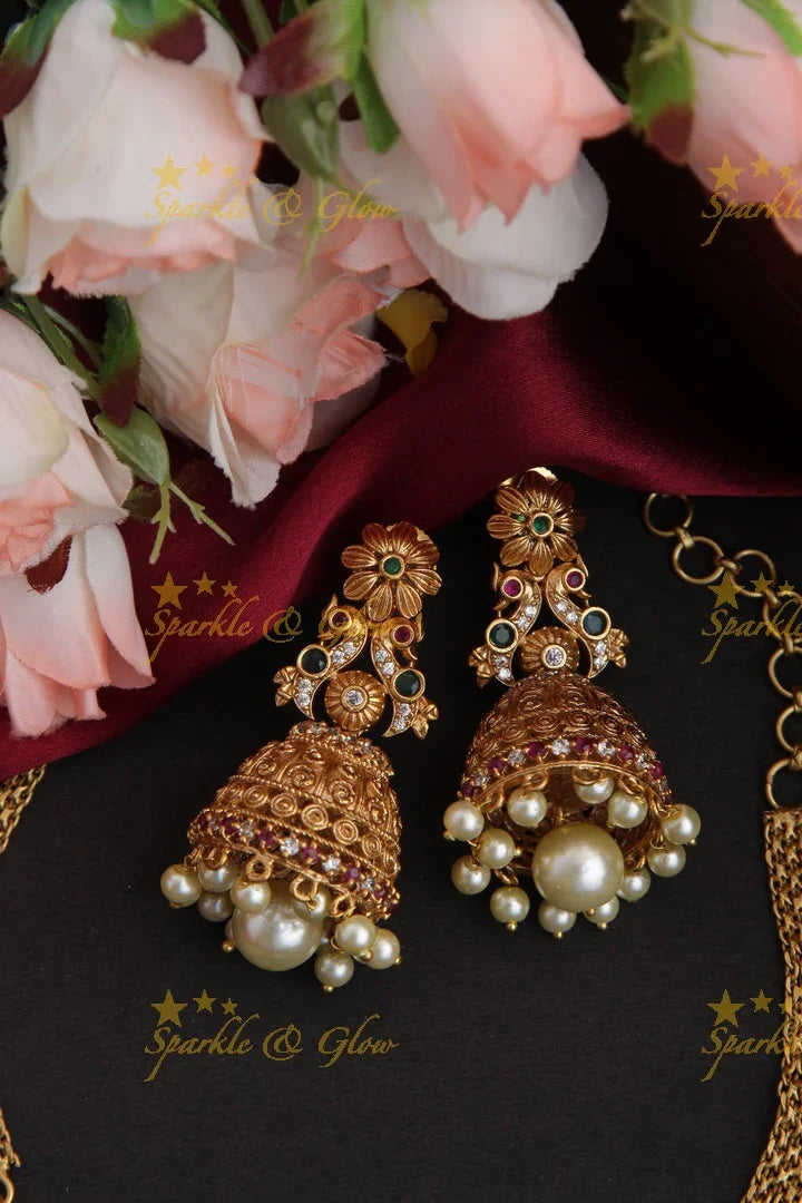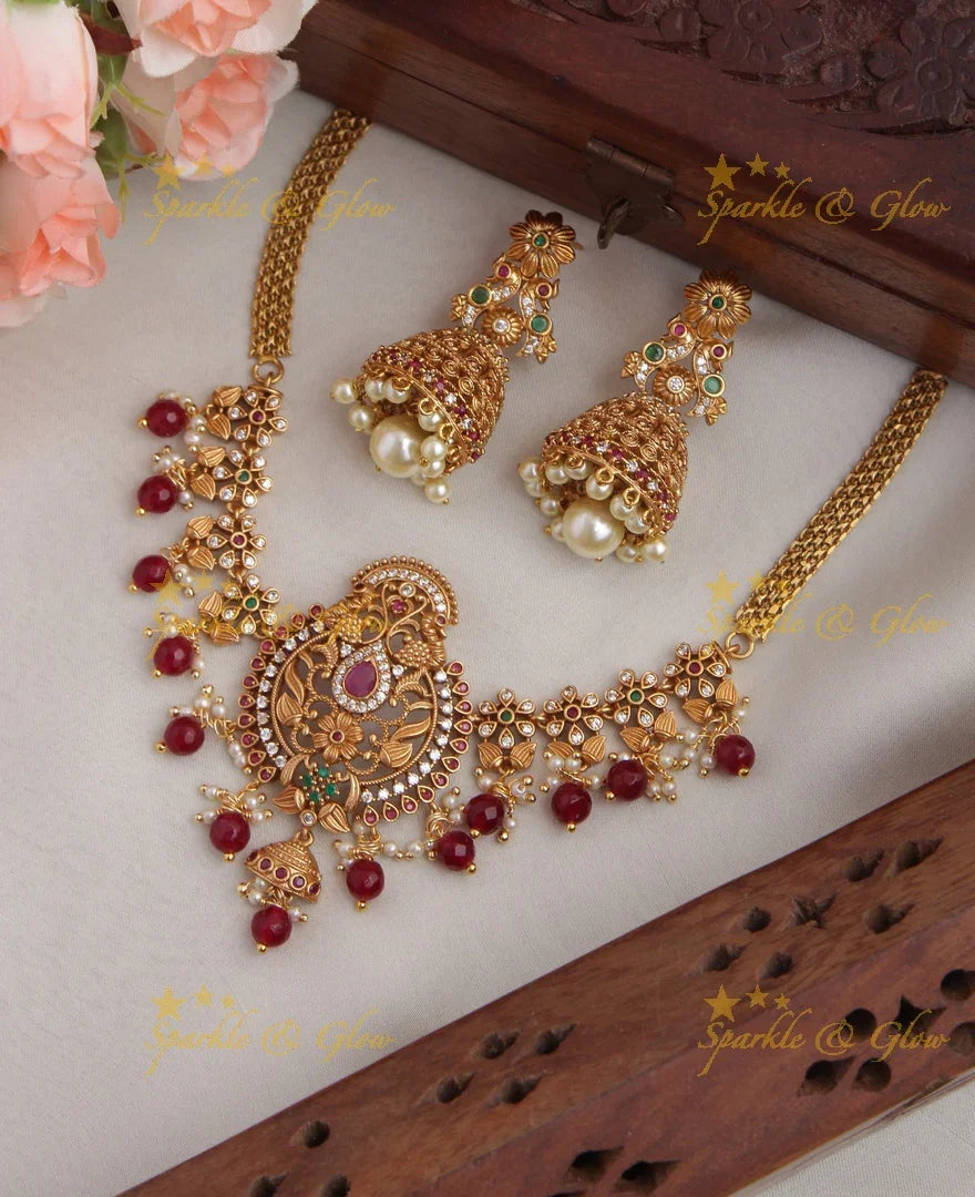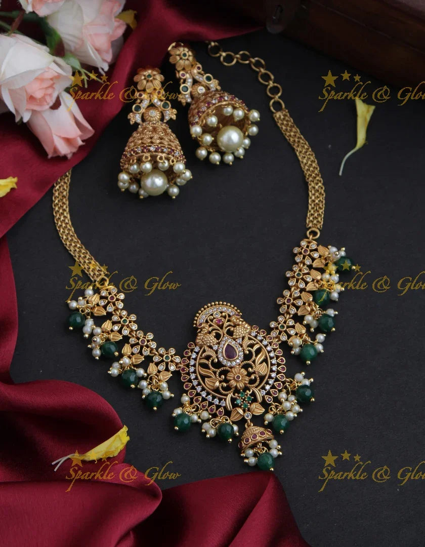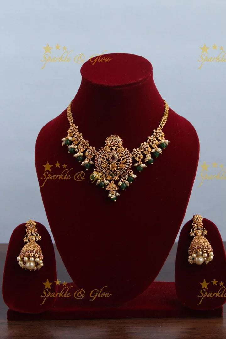 Adorn yourself with our exquisite Green Beaded CZ Floral Choker in a luxurious matte finish. This stunning piece, crafted with intricate floral motifs, captures the essence of elegance and festivity. The choker features vibrant green beads, perfectly complemented by shimmering cubic zirconia accents, creating a captivating contrast against the rich gold tone.