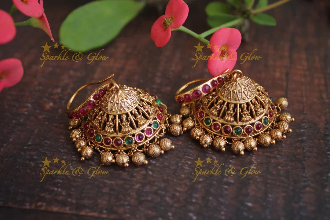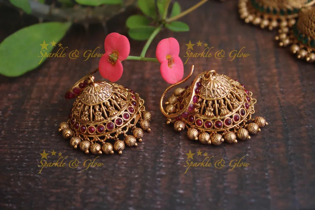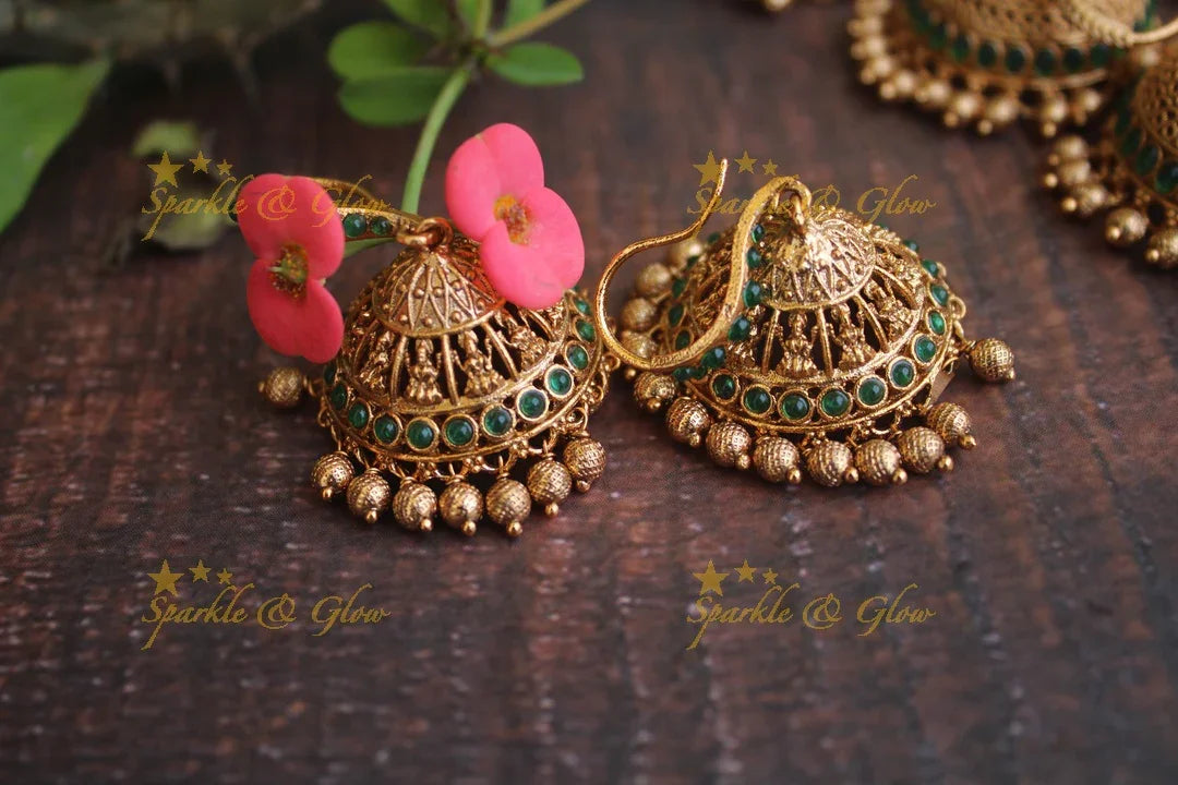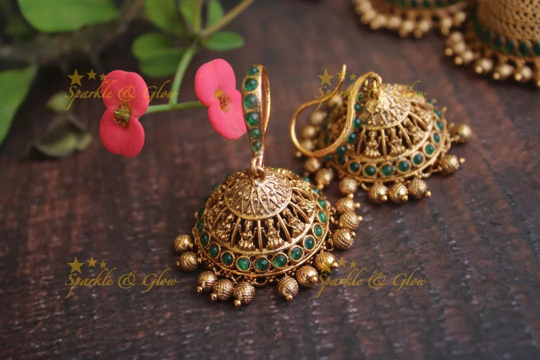 Embrace the enchanting allure of our Green Kemp Jhumkas, a true celebration of Indian craftsmanship. These matte premium hook earrings radiate elegance with their intricate gold finish, highlighted by vibrant green kemp stones. Perfect for festive occasions and weddings, these jhumkas feature exquisite motifs that dance with every movement, capturing the essence of tradition and modernity.