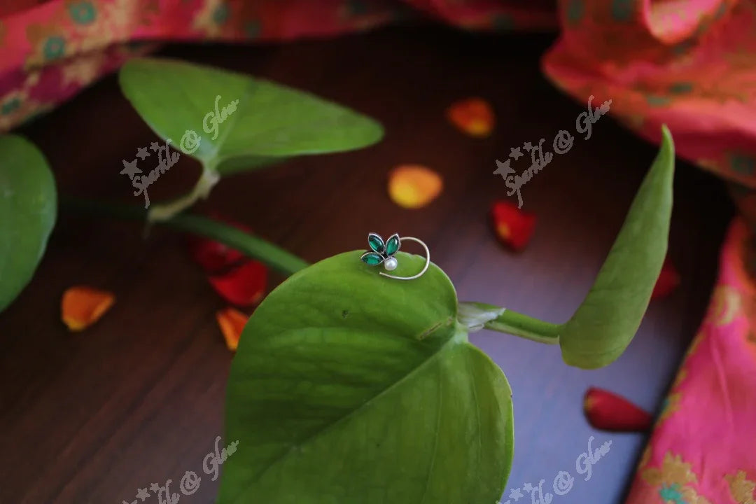 Elevate your festive look with the Green Pearl Sterling Nose Stud, a masterpiece of elegance and tradition. This exquisite nose pin features a lustrous green pearl, gracefully nestled among sterling silver leaves, creating a stunning floral motif. The vibrant green hues paired with the polished silver finish offer a harmonious blend of classic and contemporary styles, perfect for weddings and festive occasions.