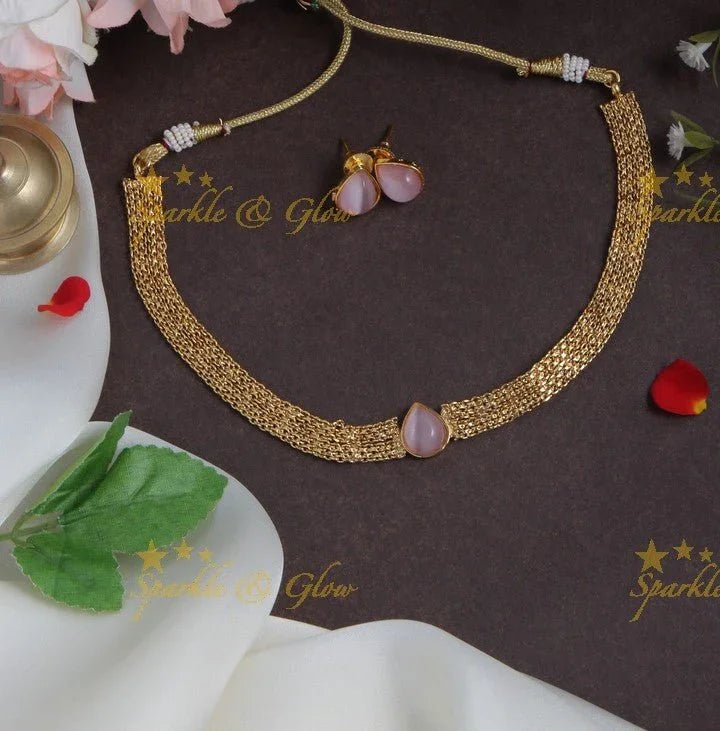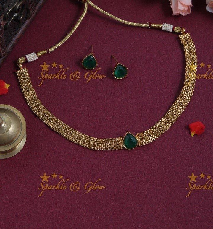 Embrace the essence of timeless elegance with our Green Stone Antique Choker Necklace. This exquisite piece is a celebration of rich heritage and modern allure, perfect for festive occasions and weddings. The choker features a captivating green stone centerpiece, beautifully complemented by intricate gold motifs that exude sophistication. The high neck design is adorned with delicate beads, providing a luxurious finish that enhances its antique charm.