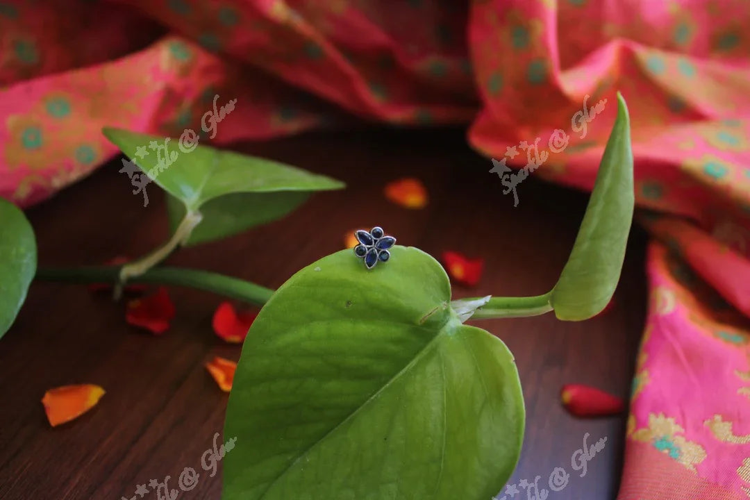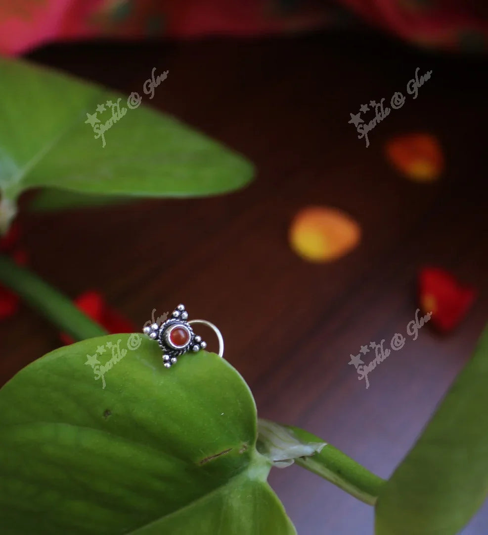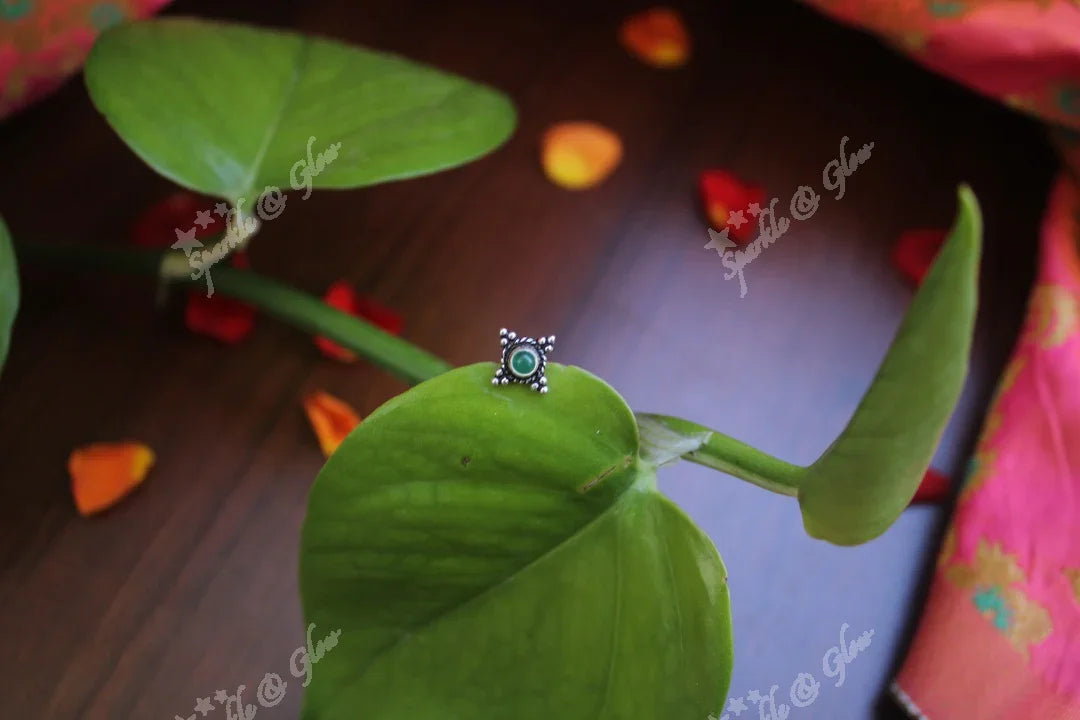 Adorn your ensemble with the exquisite Green Stone Sterling Silver Nose Pin, a perfect blend of elegance and tradition. This stunning piece features a vibrant green semi-precious stone, set in a sterling silver base, exuding a festive charm. The intricate motifs and polished finish make it ideal for any occasion, from weddings to festive gatherings.