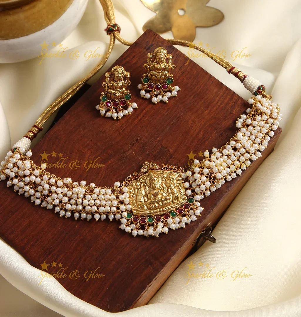 Celebrate elegance with our exquisite High Neck Nagas Pearl Cluster Choker - Gold. This stunning piece features a resplendent gold finish, adorned with intricate Nagas motifs that evoke a sense of grandeur. The choker is beautifully embellished with clusters of lustrous pearls, creating an opulent look perfect for festive occasions and weddings.