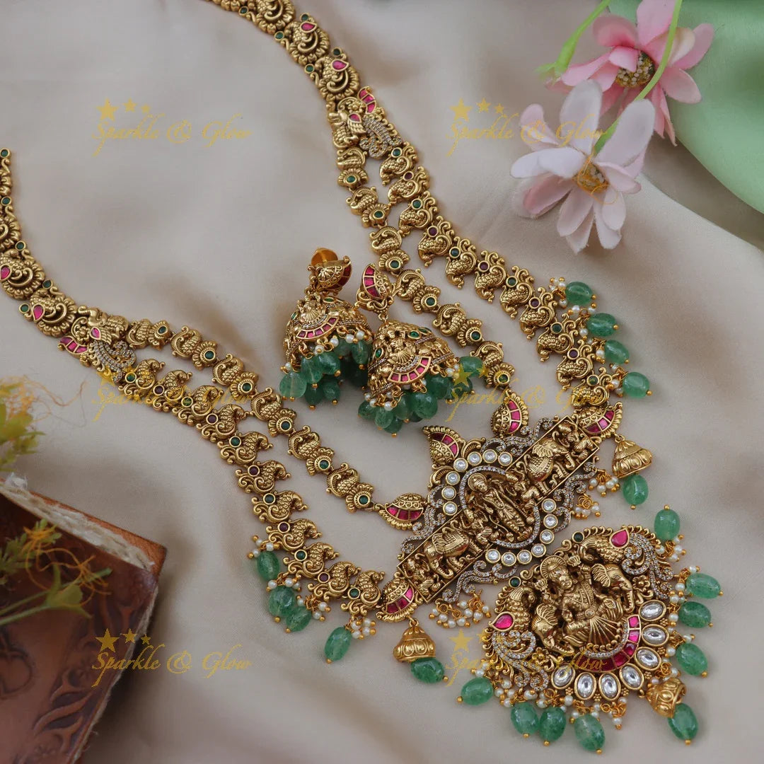 Complementing this haram are a pair of matching temple-style jhumkas, designed with cascading green bead bunches and dome-shaped carvings that mirror the motifs in the necklace. These earrings complete the set and frame the face with a touch of ceremonial glow, ideal for traditional sarees and lehengas.