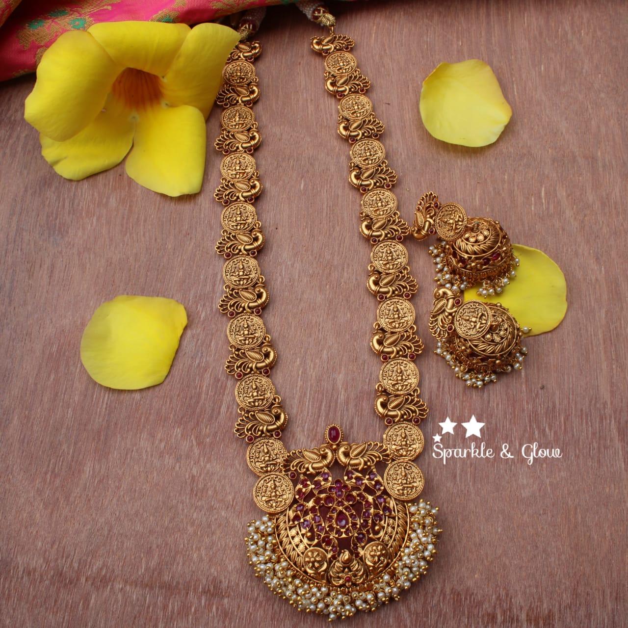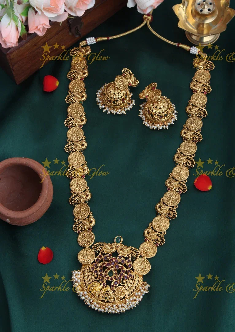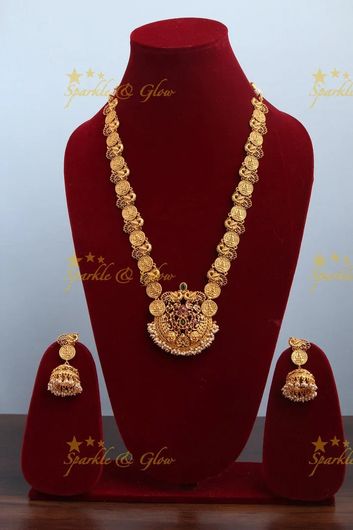 Introducing the exquisite Kemp Stone Peacock & Coin Haram in Gold Polish, a masterpiece that embodies elegance and tradition. This long necklace, adorned with intricate peacock motifs and lustrous coins, exudes a regal aura, perfect for festive and wedding occasions.
