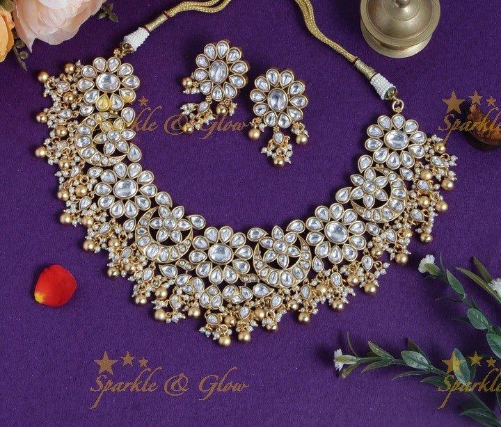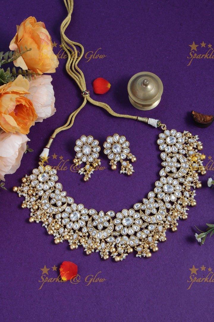 Elevate your festive ensemble with our exquisite Kundan Floral Gutta Pusalu Necklace. This remarkable piece showcases intricate floral motifs, set in a lustrous gold finish that beautifully complements the vibrant hues of traditional attire. The necklace is adorned with shimmering Kundan stones, meticulously arranged to form delicate flower patterns. Cascading pearls and beads add an elegant touch, capturing the essence of timeless Indian craftsmanship.