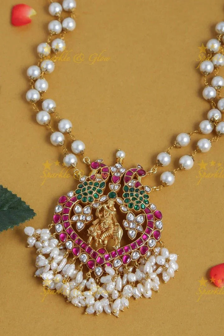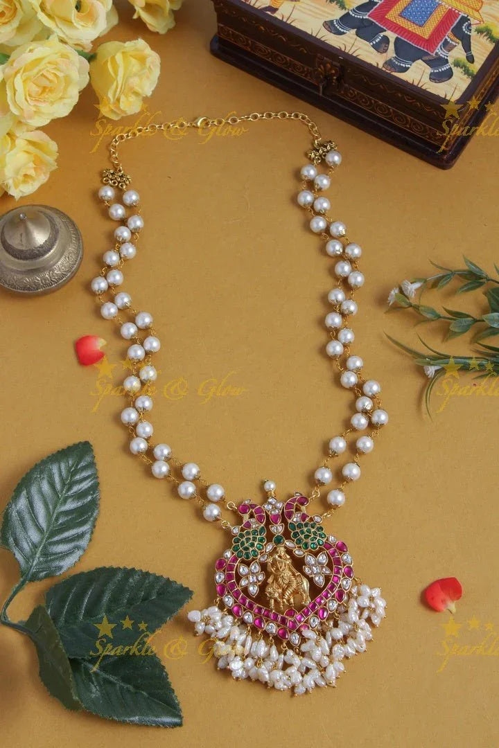 Celebrate tradition with our exquisite Kundan Peacock Krishna Pearl Necklace, a masterpiece in imitation jewellery. This elegant piece features intricate peacock motifs adorned with vibrant green and ruby-red stones, perfectly framing the divine Krishna carving. The necklace is finished with lustrous pearls, exuding a timeless elegance ideal for festive occasions.