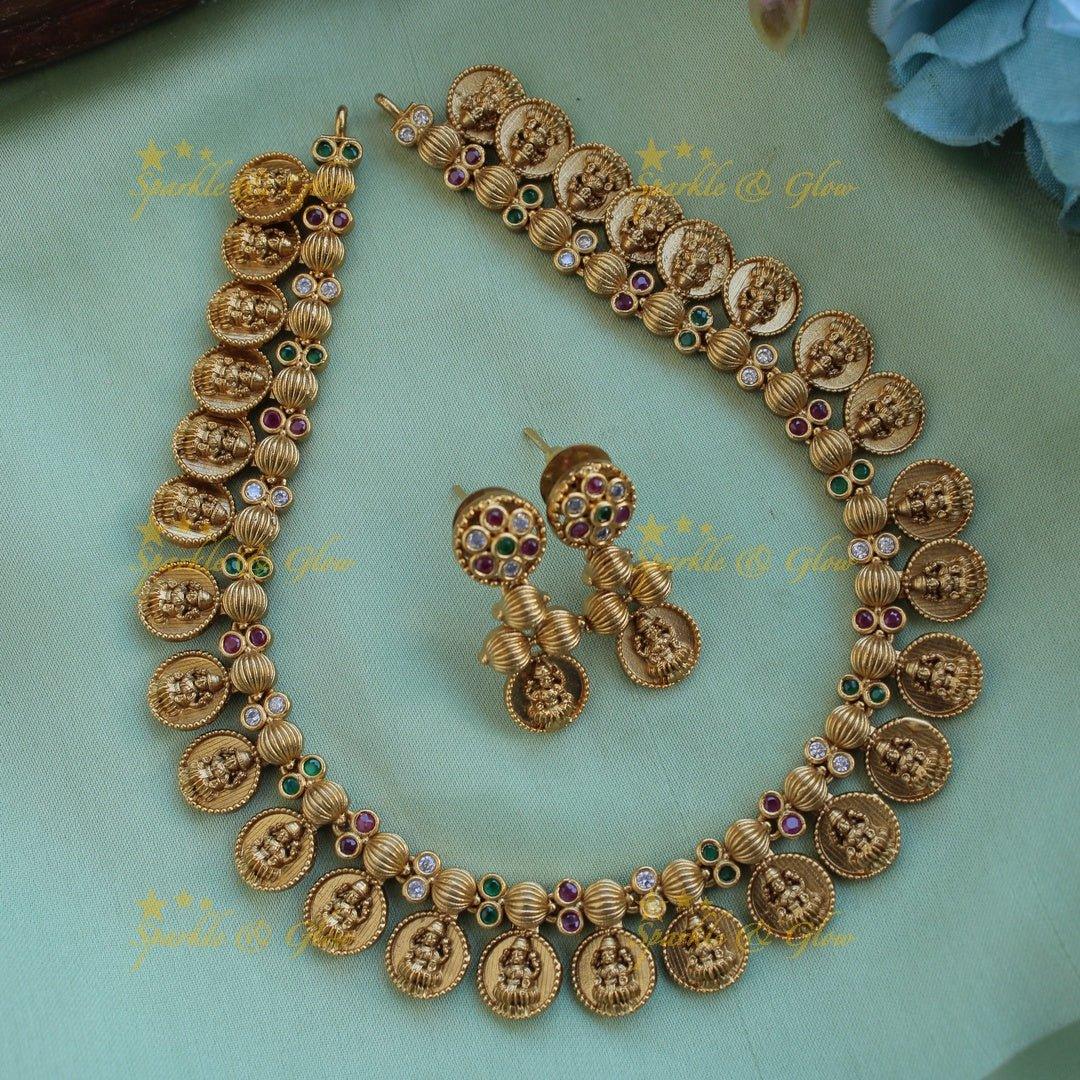 Embrace the allure of tradition with our exquisite Lakshmi Coin Necklace in Gold with Ruby & Emerald. This opulent piece features intricately designed gold-toned coins adorned with divine Lakshmi motifs, symbolizing prosperity and grace. Accentuated with vibrant ruby and emerald stones, the necklace exudes a rich palette of colors that capture the festive spirit.