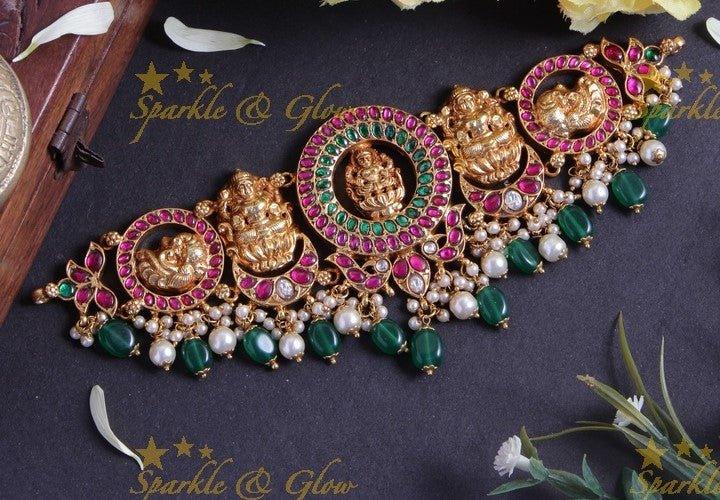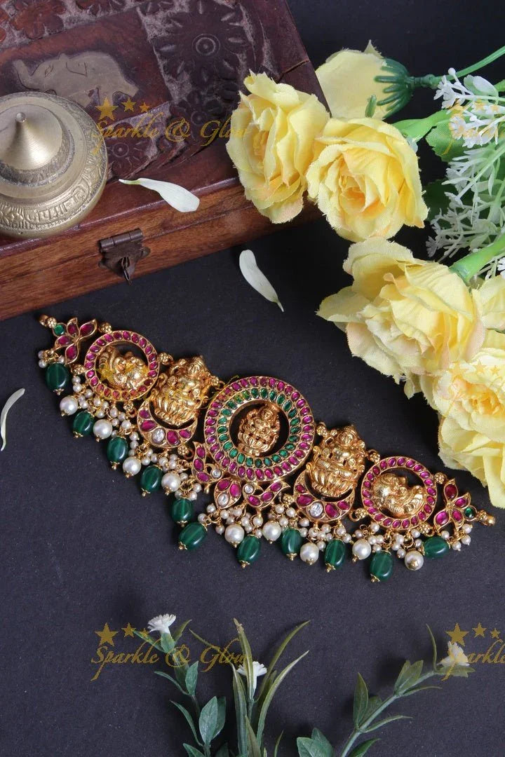 Introducing the exquisite Lakshmi Jadau Choker with Green Pearl Beads, a masterpiece of craftsmanship and elegance. This stunning choker features intricate motifs of Goddess Lakshmi, finely carved in radiant gold tones. Adorned with vibrant green pearl beads and shimmering ruby-like stones, it exudes a regal charm perfect for festive occasions and grand celebrations.