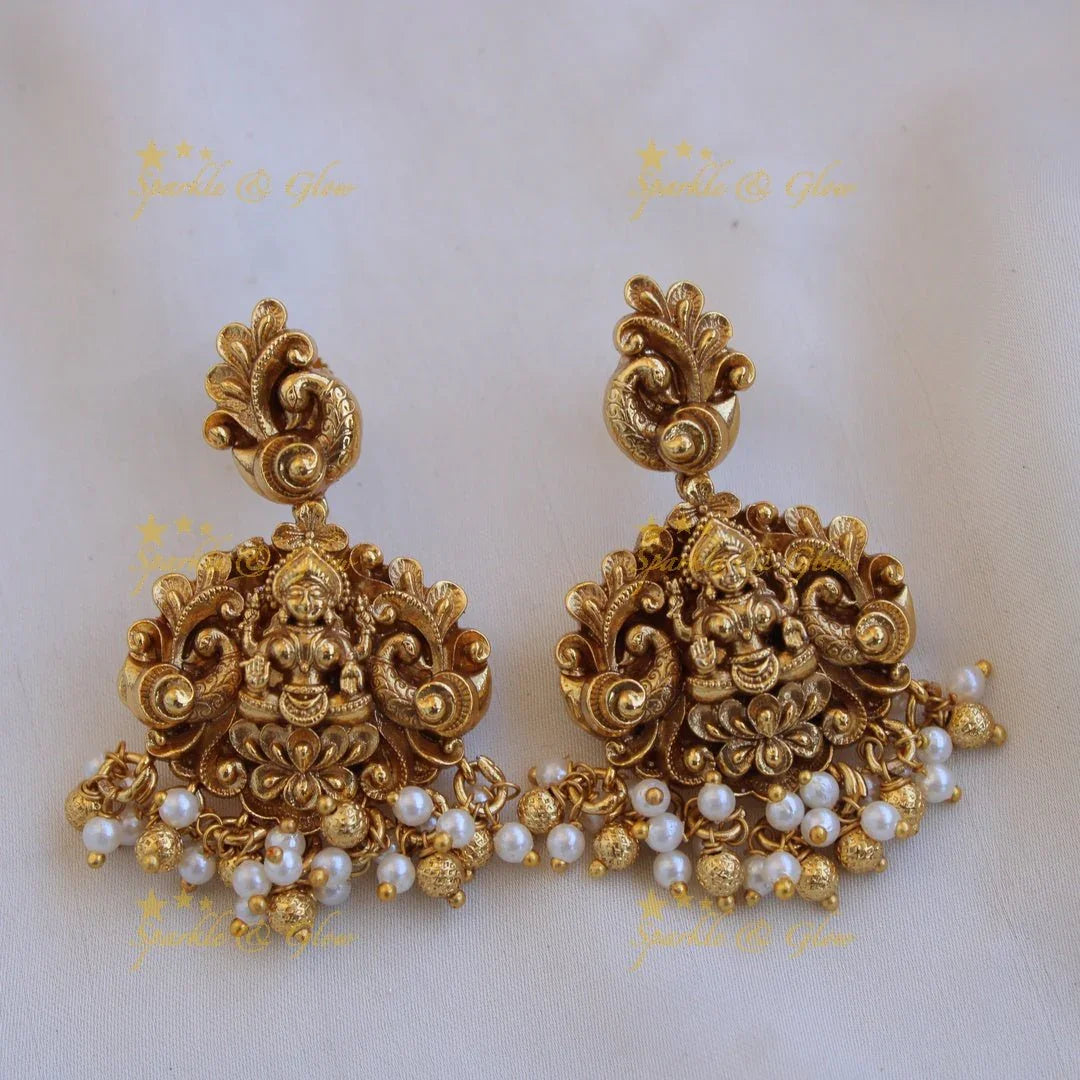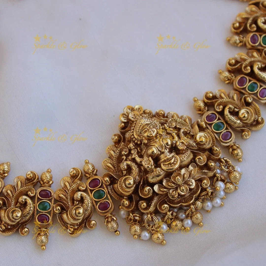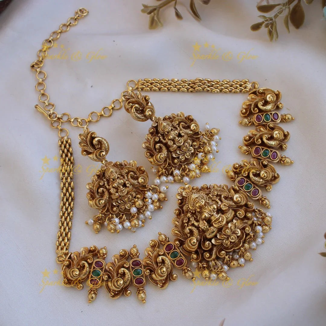 Introducing the exquisite Lakshmi Peacock Choker, a masterpiece that embodies grace and tradition. This elegant choker is adorned with intricate peacock motifs, symbolizing beauty and auspiciousness. The centerpiece showcases a beautifully carved Lakshmi, radiating divine charm.