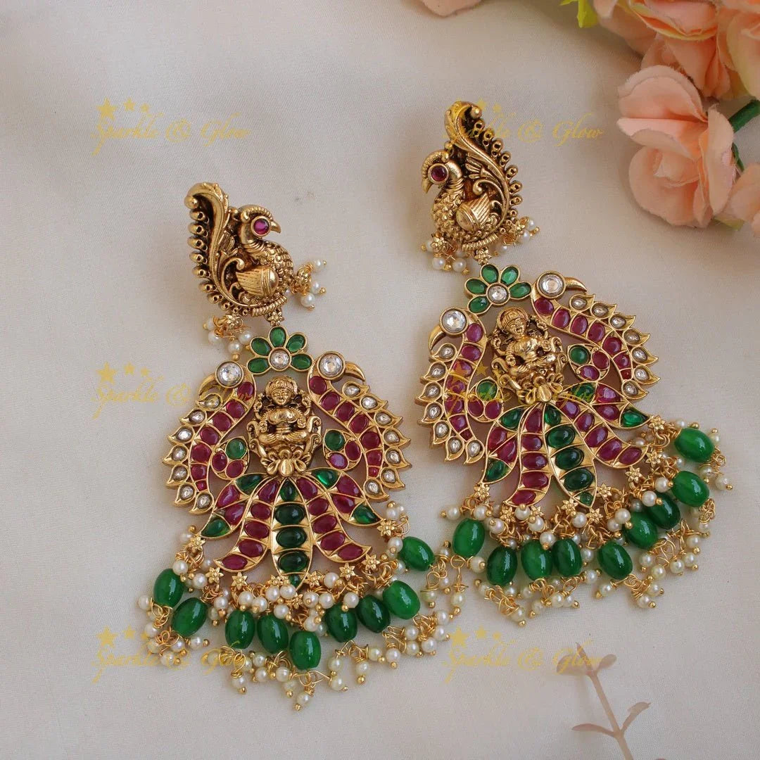 Celebrate opulence and tradition with our exquisite Lakshmi Peacock Kemp Stone Bridal Long Necklace. This masterpiece features intricately carved motifs of the goddess Lakshmi and majestic peacocks, symbolizing prosperity and beauty. Adorned with vibrant kemp stones in rich hues of red and green, the necklace is further enhanced by lustrous green beads that add a touch of elegance.
