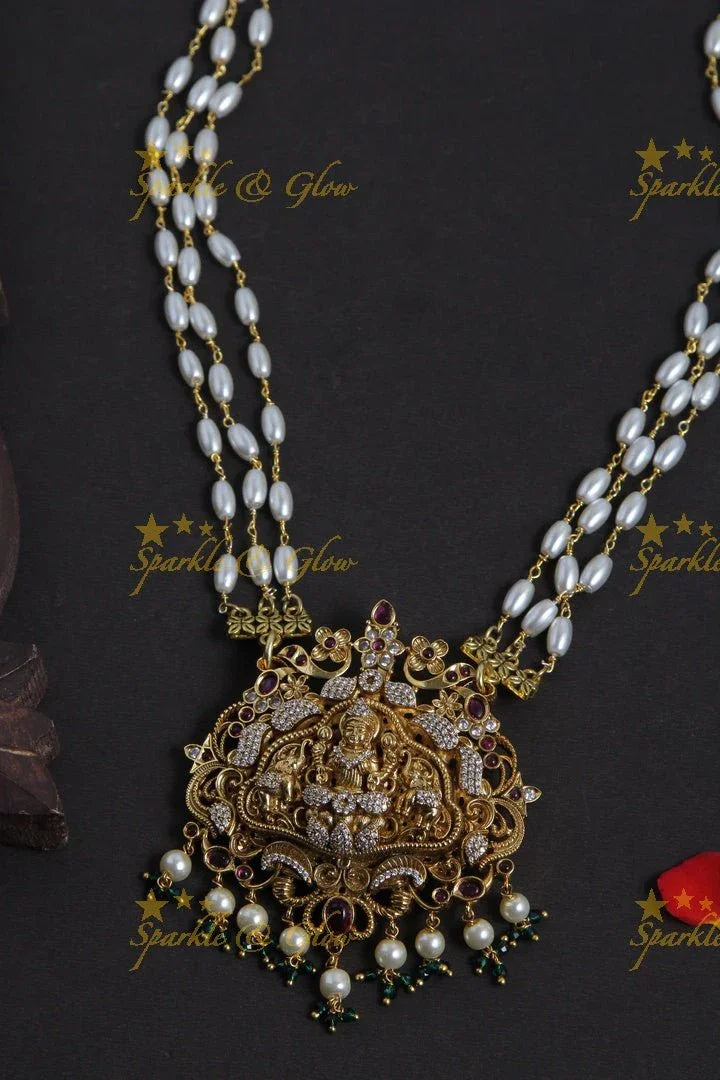 Discover the Lakshmi Pearl Pendant Necklace, an exquisite piece that encapsulates the essence of traditional Indian artistry. This beautiful necklace features a finely carved Lakshmi motif, symbolizing prosperity and good fortune, nestled amidst a cascade of lustrous pearls. The intricate detailing is accentuated with a regal gold finish, accompanied by delicate ruby-colored stones that add a touch of opulence.