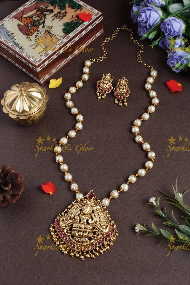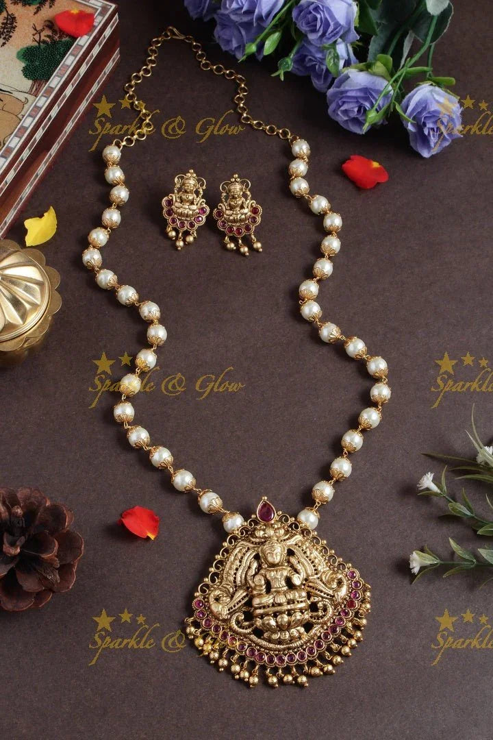 Embrace the divine elegance of our Lakshmi Pendant Pearl Necklace, a masterpiece that embodies the essence of tradition and grace. This exquisite piece features a meticulously carved Lakshmi pendant, symbolizing prosperity and auspiciousness, surrounded by vivid ruby-red motifs. The intricate detailing and antique gold finish reflect the artistry of temple jewellery, offering a timeless allure.