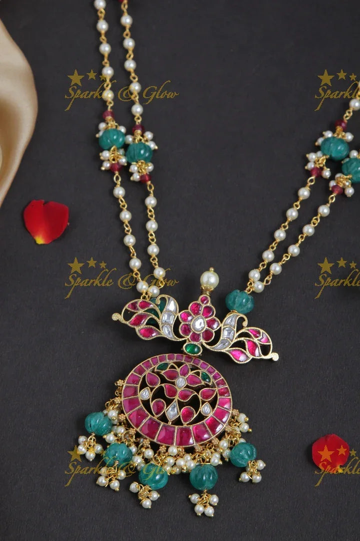 The pendant is perfect for festive occasions and weddings, adding a touch of grandeur to your attire. Its long necklace design, known as haram, ensures it stands out as a statement piece.