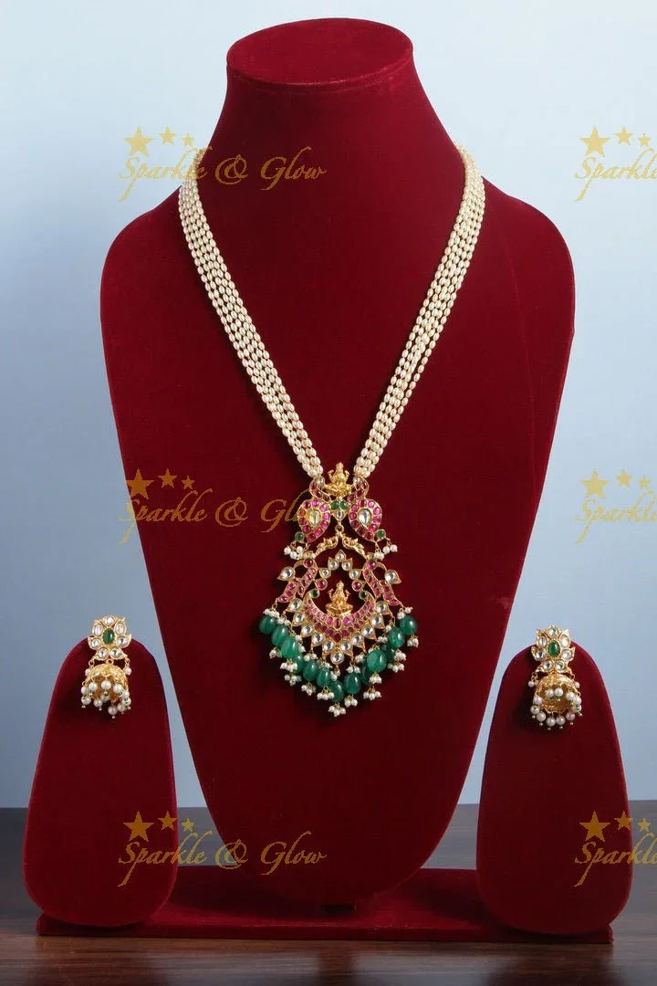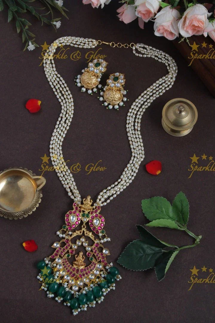 The necklace is elegantly strung with lustrous green beads, adding a touch of verdant freshness to the luxurious design. Perfect for festive occasions and weddings, this necklace complements both traditional and contemporary attire.