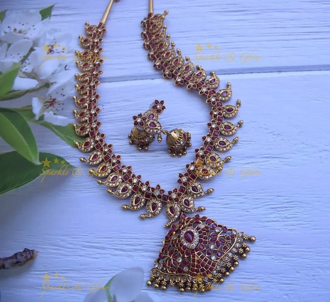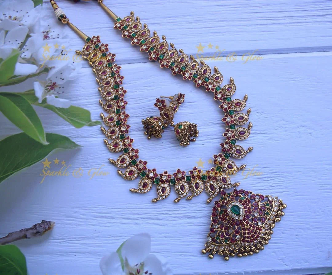 Embrace the allure of tradition with the Mango Peacock Necklace with CZ & Kemp - Matte Gold Finish. This exquisite piece features a harmonious blend of vibrant kemp stones and sparkling cubic zirconia set in a luxurious matte gold finish. The necklace showcases intricate peacock and mango motifs, symbolizing grace and prosperity, making it an ideal choice for weddings and festive occasions.