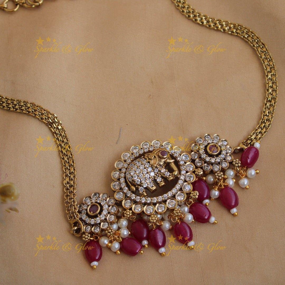 Unveil the essence of regal elegance with our Maroon Beaded Victorian AD Floral Choker. This exquisite piece showcases a stunning elephant motif at its heart, surrounded by intricate floral designs adorned with shimmering American diamonds. The rich maroon beads add a touch of opulence, perfectly complementing the antique gold finish. Ideal for festive occasions, this choker is a statement of timeless grace and sophistication.