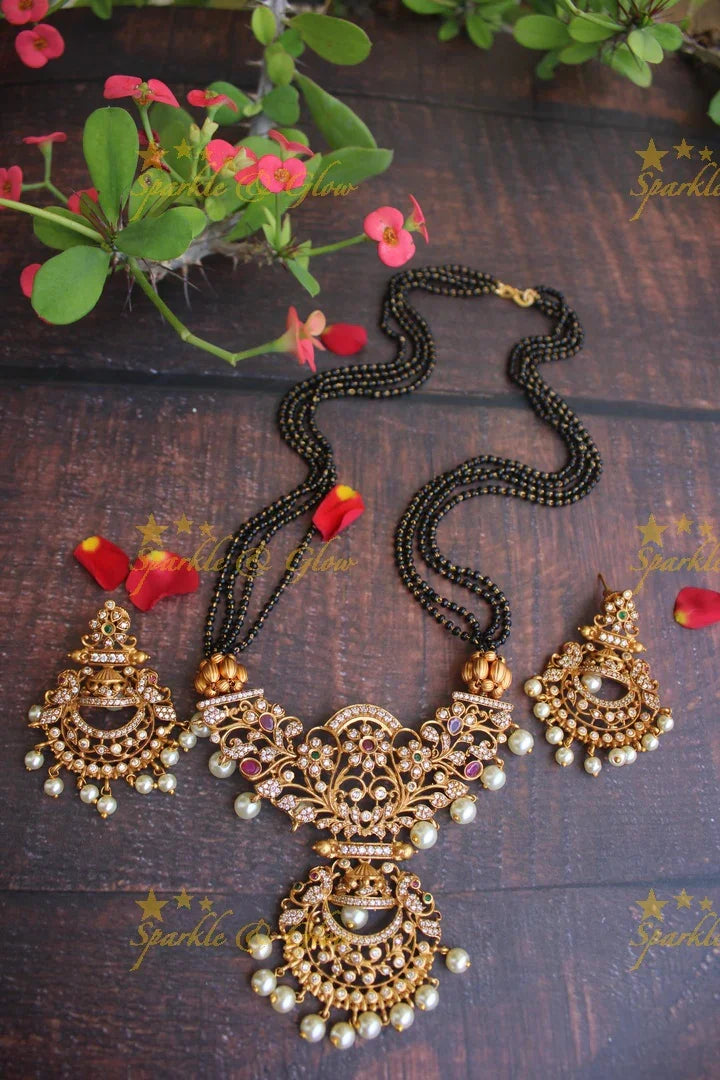 Elevate your festive ensemble with our exquisite Matte Black Beads CZ Stone Pendant Long Chain. This stunning piece features intricate gold motifs adorned with sparkling Cubic Zirconia stones, offering a timeless elegance that complements any traditional attire. The matte black beads add a touch of mystique, making it a perfect choice for weddings and celebrations.