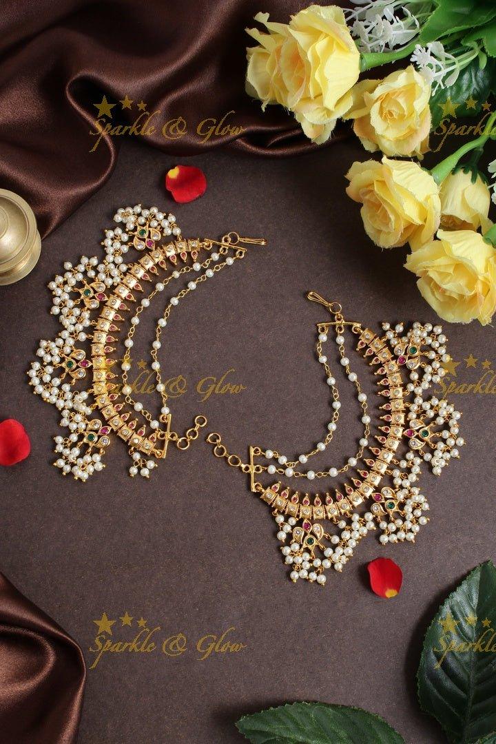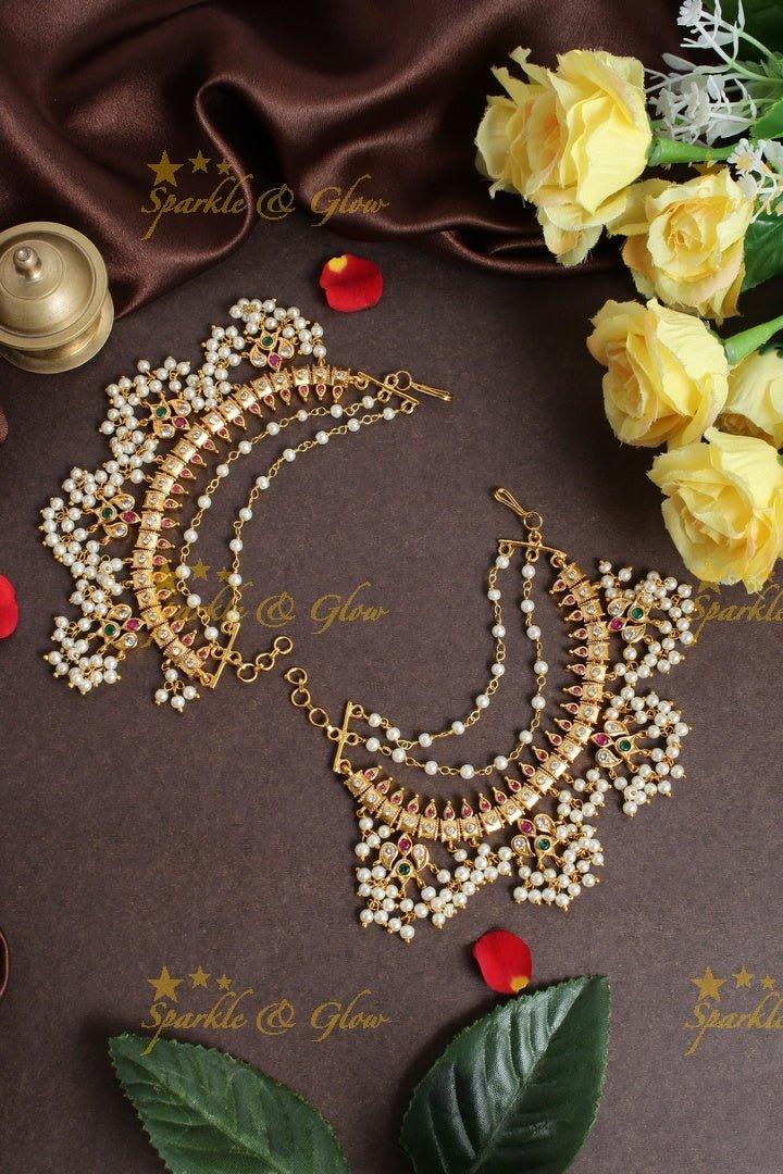 Each ear chain is meticulously crafted to resemble the classic Guttapusalu style, known for its unique blend of elegance and grandeur. The delicate pearl clusters add a touch of softness and grace, while the intricate detailing reflects the artistry of traditional temple jewellery.