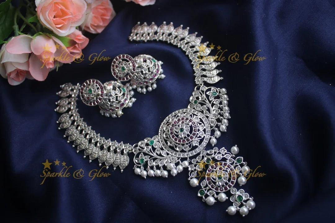 Embrace the timeless elegance of the Matte Silver CZ Lakshmi Coin Necklace, a stunning piece that embodies the rich tradition of Indian festive wear. This exquisite necklace features intricate Lakshmi coin motifs, resplendent with the brilliance of cubic zirconia stones. The soft matte silver finish adds a touch of understated luxury, making it perfect for weddings and festive occasions.