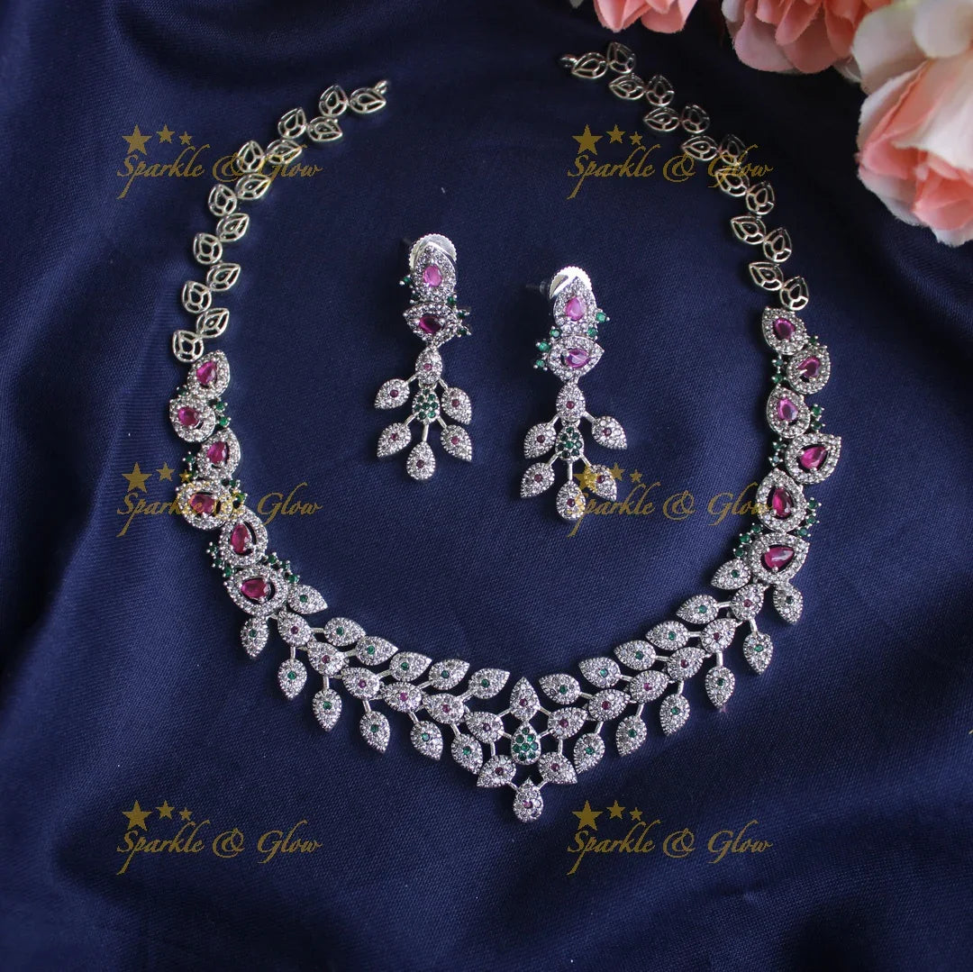 Embrace timeless elegance with our Matte Silver CZ Stone Leaflet Necklace. This exquisite piece features intricate leaflet motifs adorned with sparkling cubic zirconia stones, creating a shimmering cascade of brilliance. The subtle matte silver finish adds a touch of sophistication, making it perfect for festive occasions and weddings.