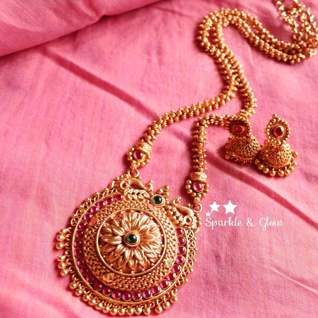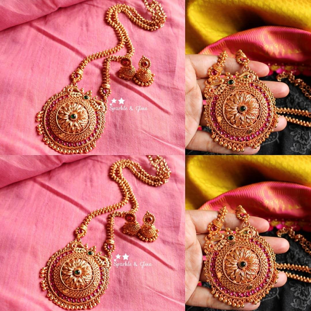 The pendant is suspended from a beautifully crafted chain that enhances its grandeur, making it a captivating centerpiece for any ensemble. Pair it with your favorite festive attire for a look that is both timeless and enchanting.