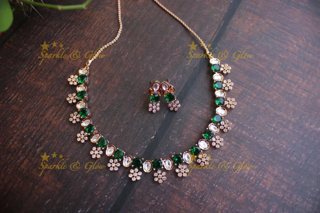Embrace elegance with our Mint Green Kundan & American Diamond Necklace, a masterpiece of traditional artistry and modern design. This exquisite piece features intricate floral motifs adorned with lush mint green beads and sparkling American diamonds, set against a luxurious rose gold finish.