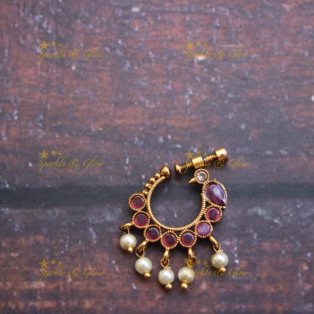 Embrace the elegance of tradition with our exquisite Multicolor Antique Gold Peacock Nose Stud. This piece embodies the grace of Indian heritage, adorned with a beautifully crafted peacock motif that captivates with its intricate design. The nose stud features a harmonious blend of vibrant multicolored stones, accentuated by delicate gold beads, offering a festive flair perfect for weddings and special occasions.