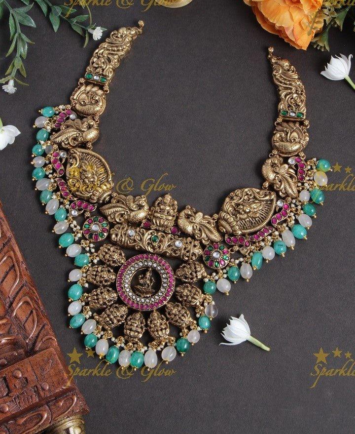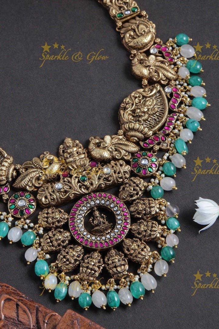 Discover the exquisite artistry of the Nagas Jadau Short Necklace with Green & Pink Beads. This stunning piece blends traditional elegance with contemporary flair, perfect for festive occasions. The necklace showcases intricate motifs with a captivating antique finish, adorned with vibrant light green and pink beads that add a splash of color and elegance to your ensemble.