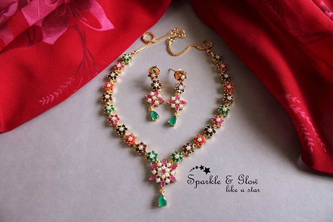 Introducing the exquisite Navaratna Stone AD Floral Necklace, a masterpiece of elegance and tradition. This stunning necklace is adorned with vibrant navaratna stones, each representing the nine celestial planets, artfully crafted into delicate floral motifs. The intricate detailing of American Diamond (AD) embellishments adds a touch of luxury, making it perfect for festive occasions.
