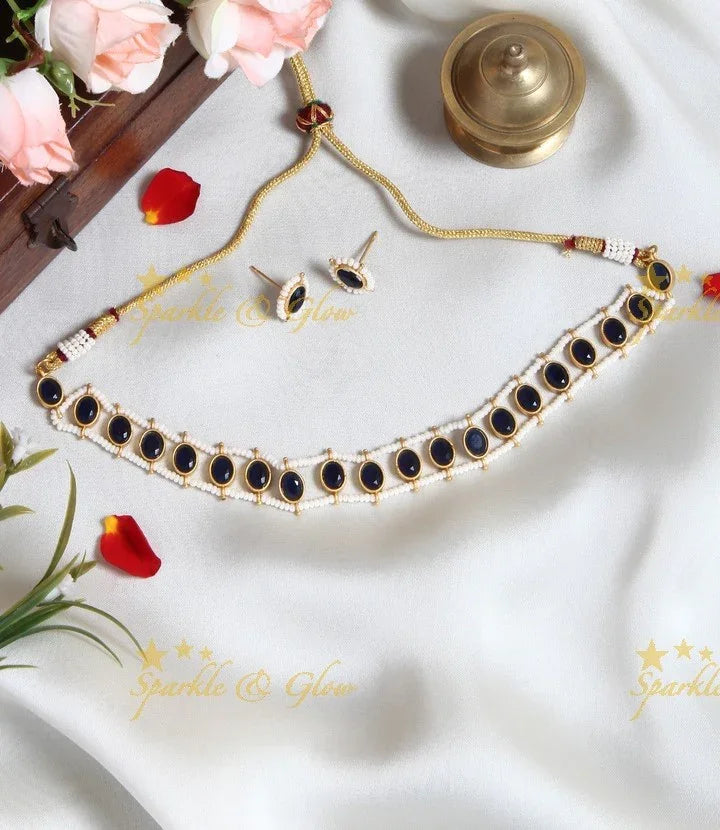 Discover the allure of our Navy Blue Pearl Cluster Stone Choker Necklace, a true embodiment of elegance and festivity. This exquisite piece features a stunning cluster of navy blue pearls, elegantly outlined by shimmering stones that capture the light from every angle. The intricate gold finish adds a touch of opulence, making it the perfect accessory for weddings and festive occasions.